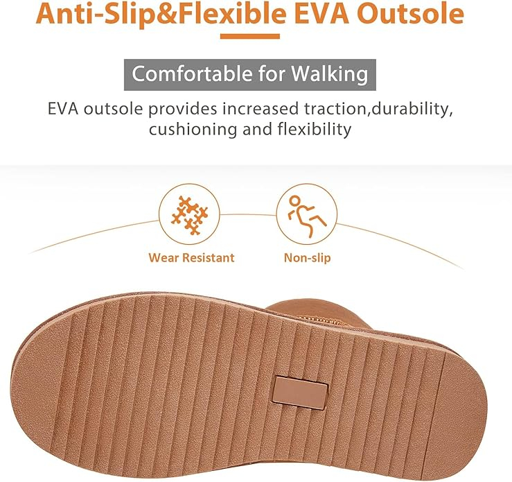 Talpa durabilă și antiderent EVA a acestor cizme de iarnă oferă mai multă tracțiune și durabilitate pentru utilizare în aer liber. Designul acestor cizme scurte este anti-alunecare și susține arcul, iar părțile laterale din cauciuc oferă frecare cu podeaua.