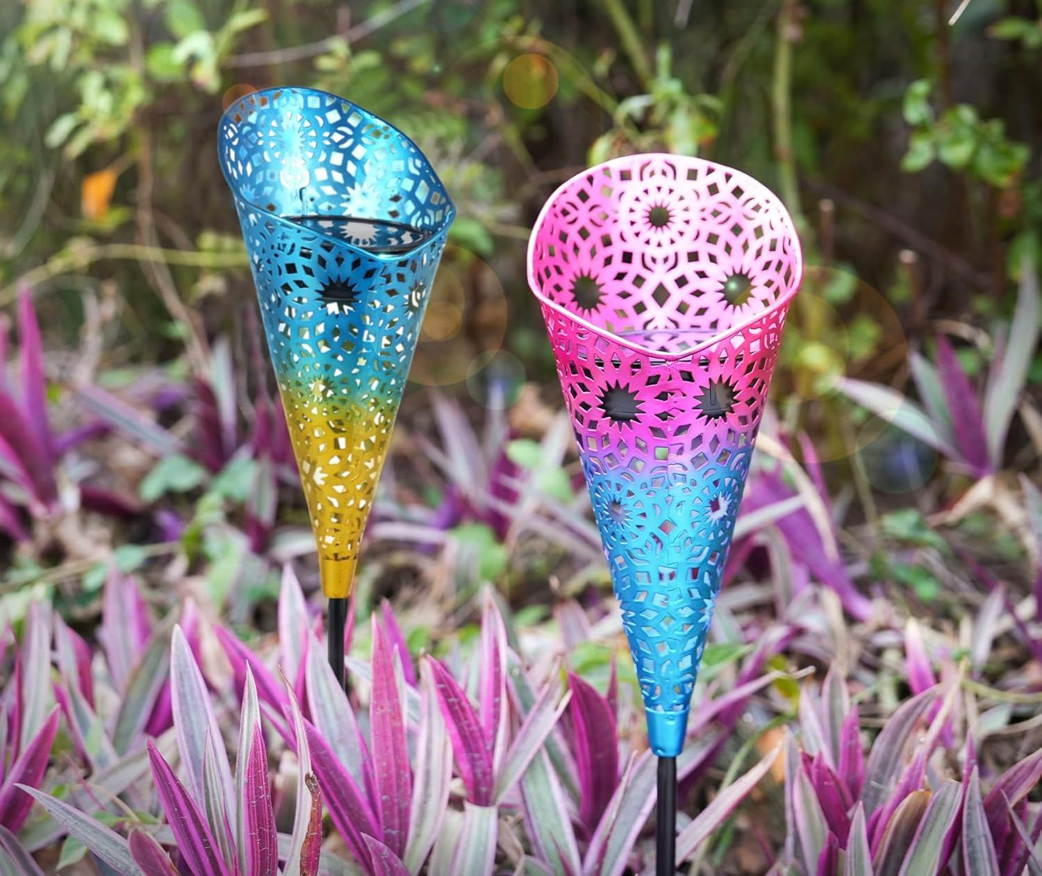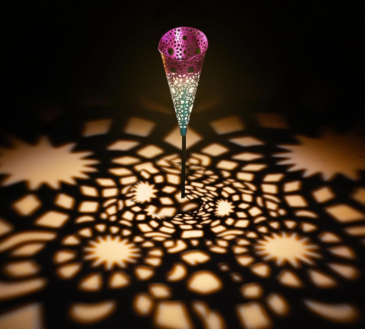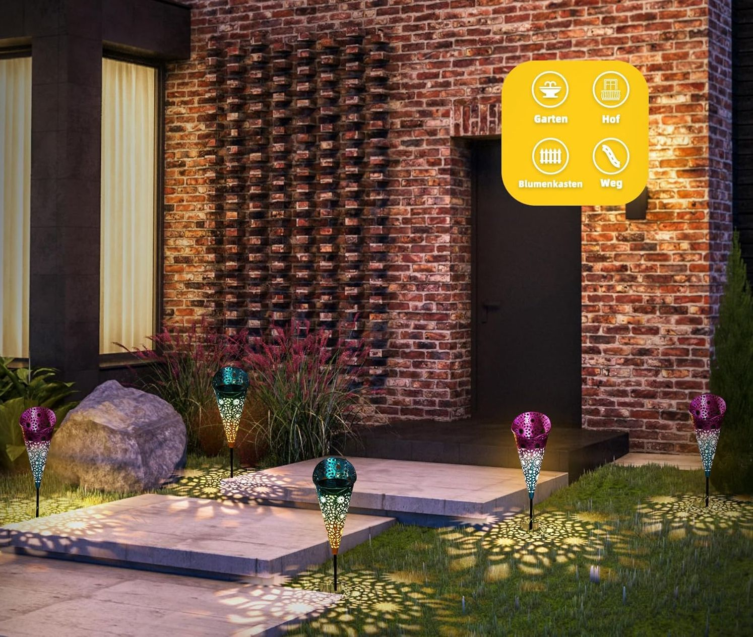 Decorațiuni frumoase: Cu modelul clasic gol și aspectul vânturilor magnifice cu culoare albastră, violet și auriu, luminile solare retro metalice pentru uz exterior oferă spațiului dvs. exterior o culoare și creează o atmosferă atractivă. Luminile solare pentru gradina in aer liber sunt un cadou perfect pentru familiile si prietenii tai.