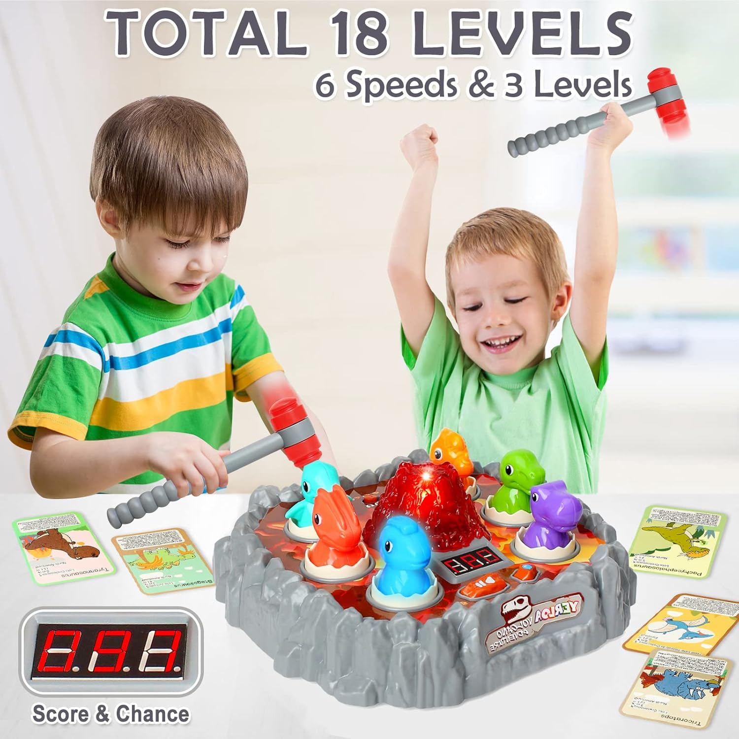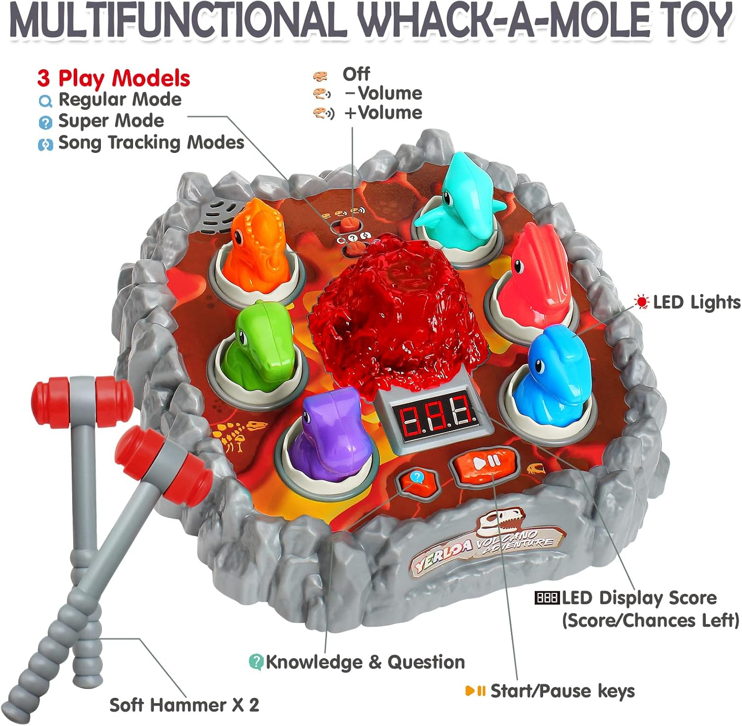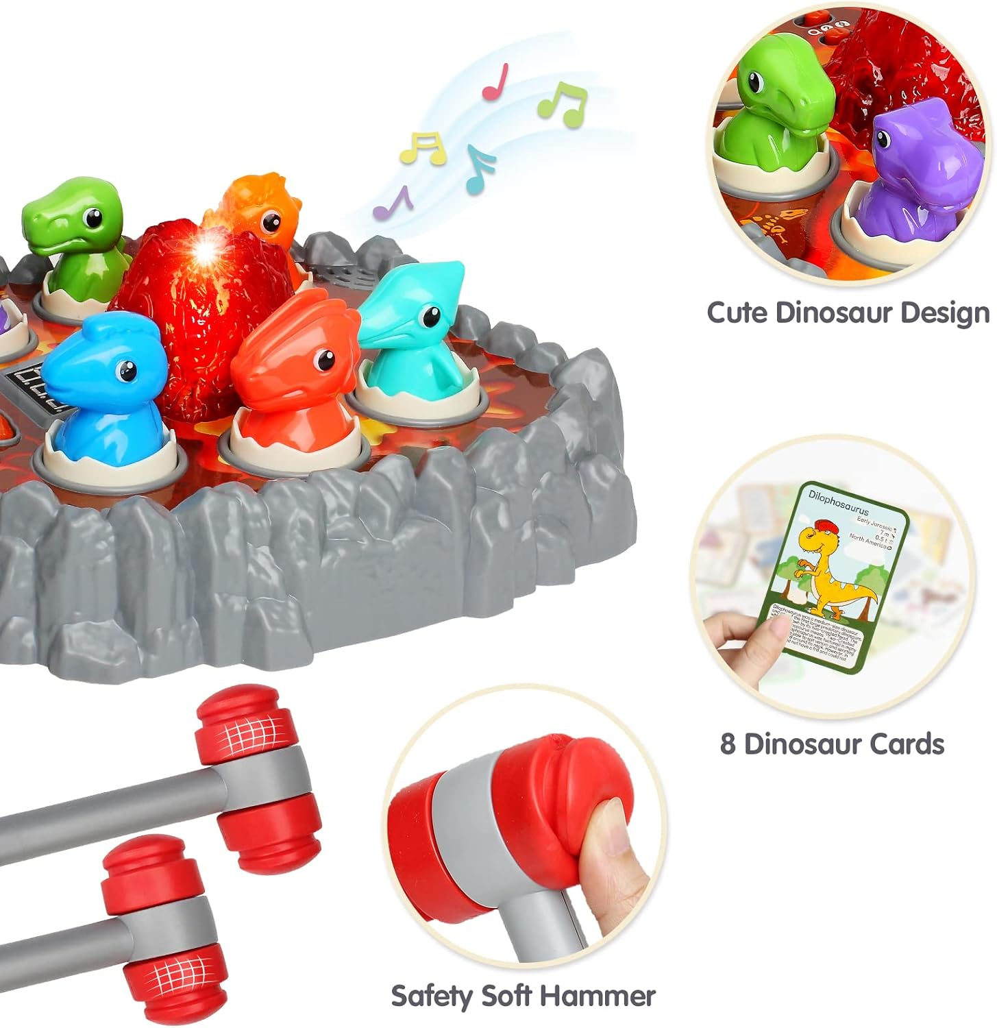 Joc nou și îmbunătățit de whack-A: Această jucărie este concepută pentru copii cu vârsta cuprinsă între 3-7 și include 6 dino colorate, un vulcan realist, 2 ciocane moi și 8 cărți de vizită la dino. Cu 6 viteze și 3 moduri, copiii se pot bucura de diferite niveluri de distracție.