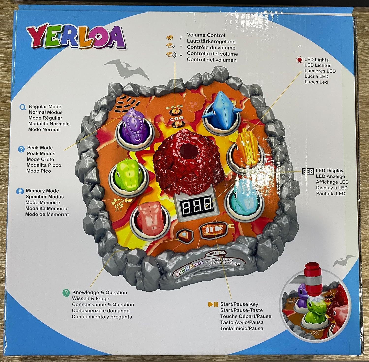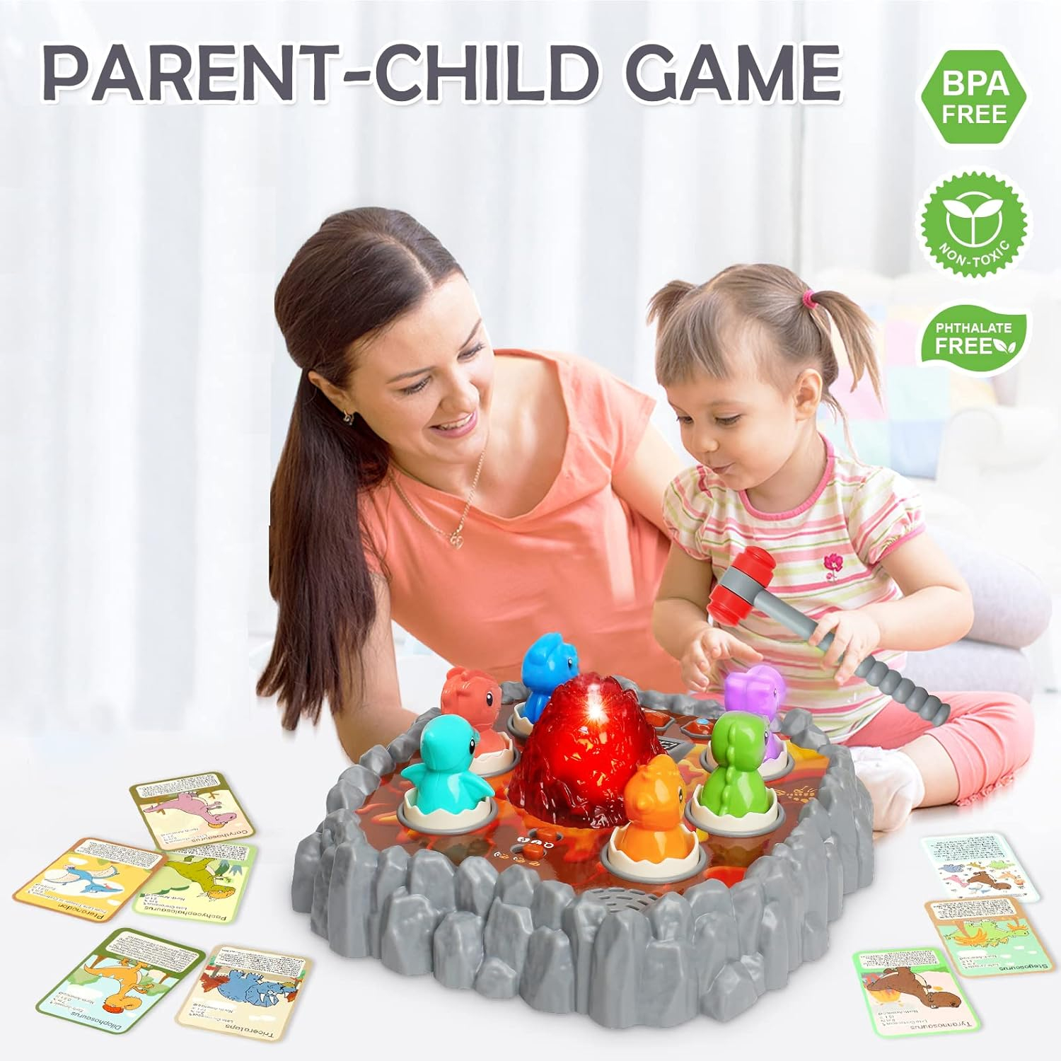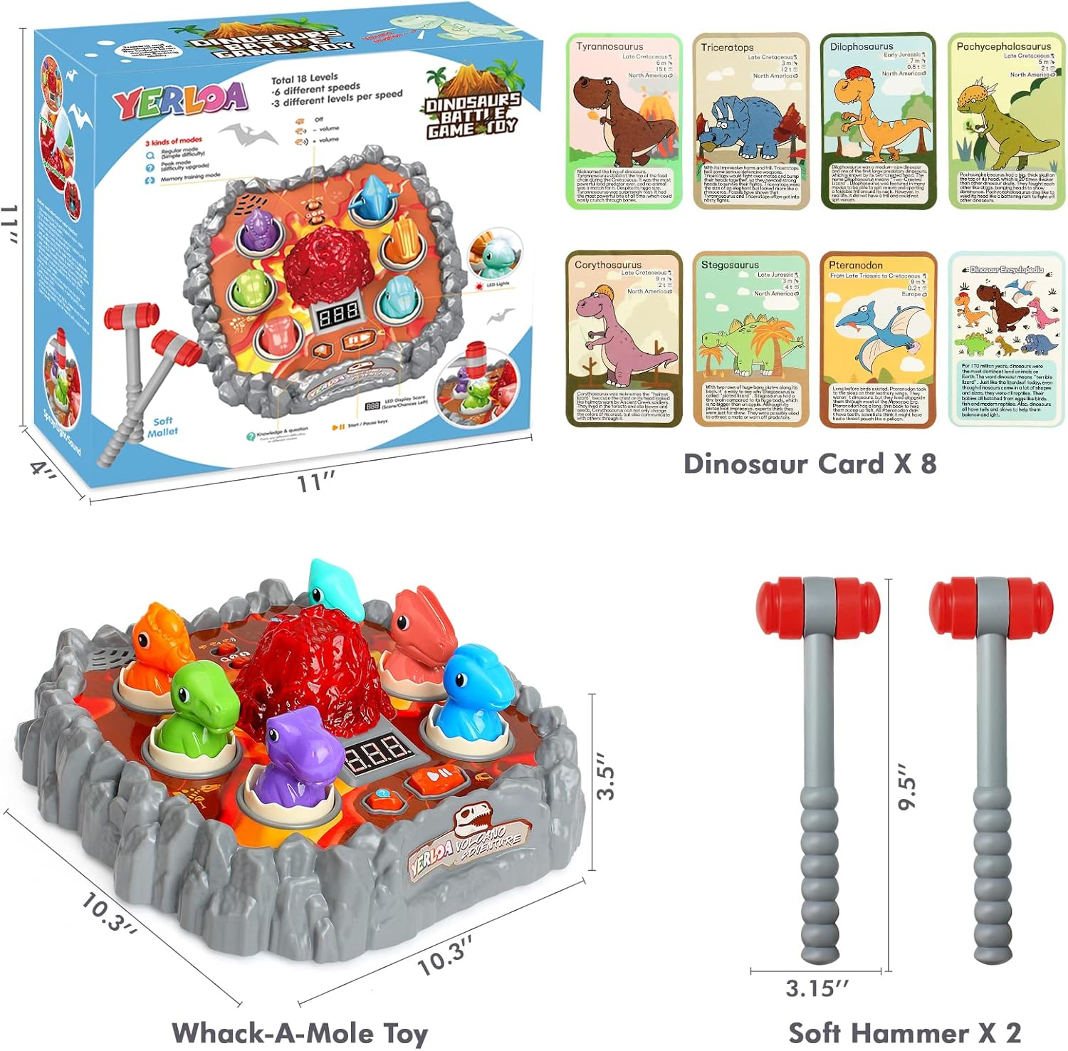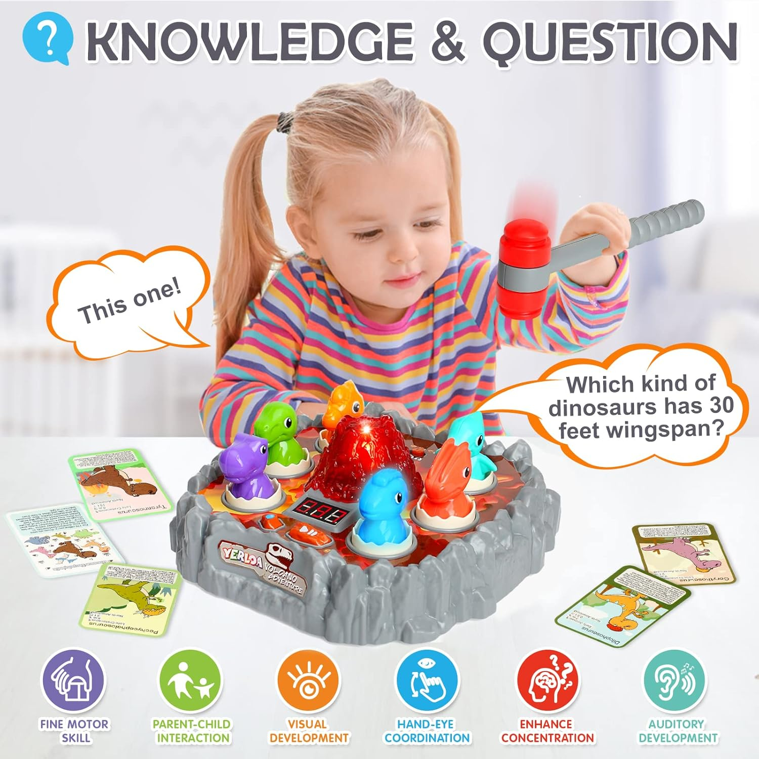 Joc nou și îmbunătățit de whack-A: Această jucărie este concepută pentru copii cu vârsta cuprinsă între 3-7 și include 6 dino colorate, un vulcan realist, 2 ciocane moi și 8 cărți de vizită la dino. Cu 6 viteze și 3 moduri, copiii se pot bucura de diferite niveluri de distracție.