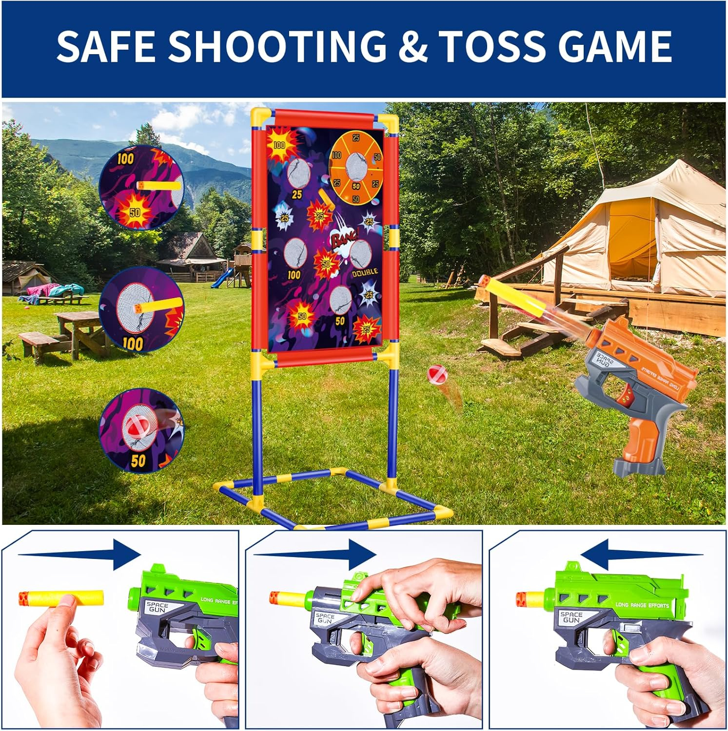 JOC DE FOC CU 2 ARME DE JUCĂRIE ȘI 16 GLOANȚE DE SPUMĂ - Include 2 tunuri de jucărie și 16 gloanțe de spumă sigură pentru practicarea țintei interesante. Jocul de fotografiere îi ajută pe copii să îmbunătățească coordonarea, focalizarea și precizia ochilor de mână în timp ce au o explozie.