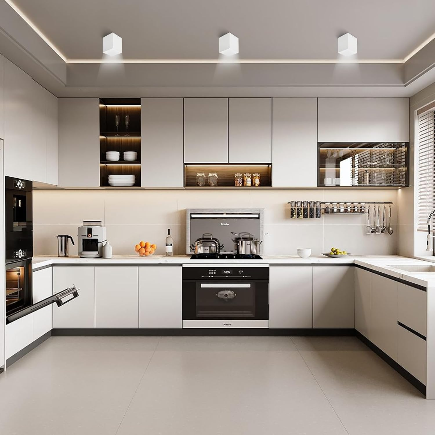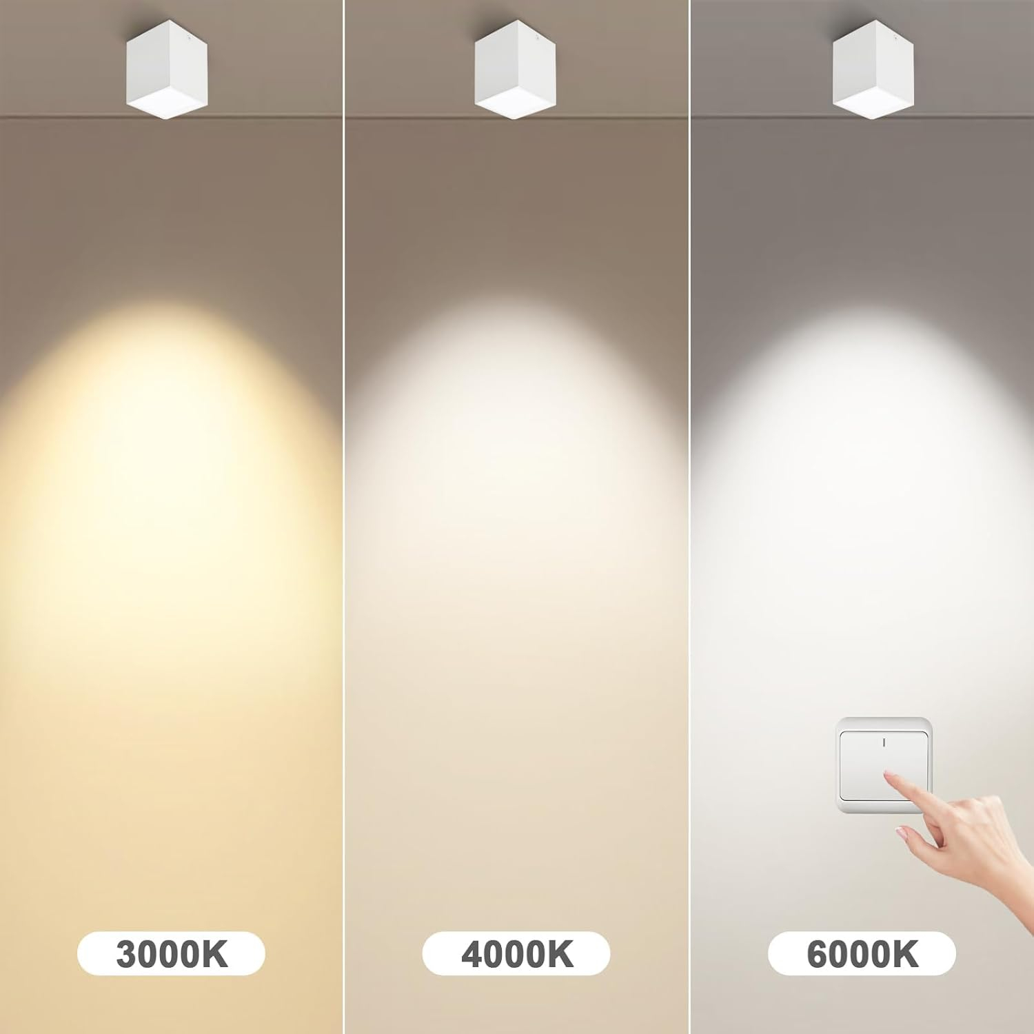 • 3 funcție de temperatură/memorie: lumina de plafon a luminii reflectoarelor poate fi comutată între temperaturile de culoare (3000 K - 4000 K - 6000 K, alb cald, alb neutru și alb rece) cu comutatorul de perete. În plus, lampa are o funcție de memorie care salvează ultima setare, astfel încât să nu fie necesară resetarea următoarei date.