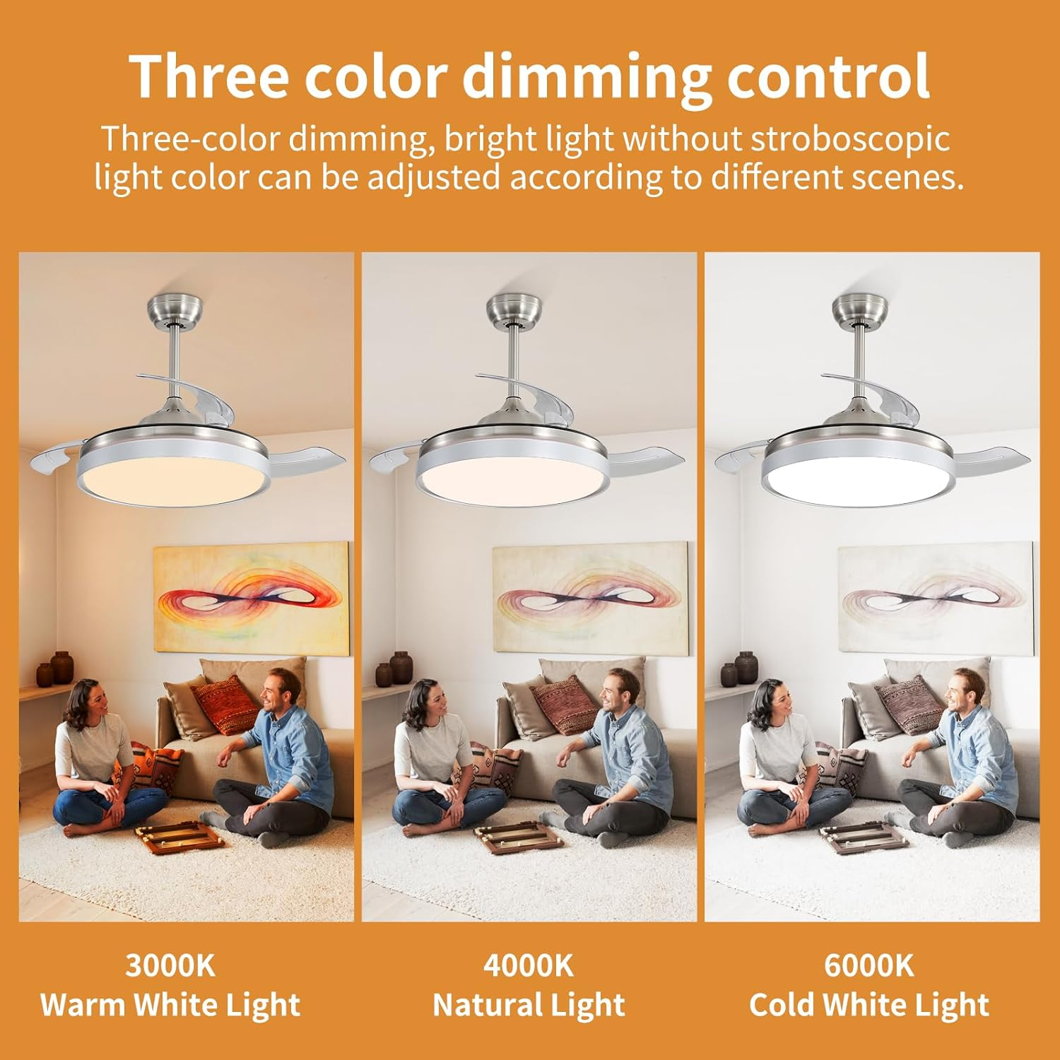 • În cală de transfer al planului PM1vern pe tavanul de mână a ventilatorului cu 3 axe transparente ABS, are 6 viteze pentru selecție și 3 lumină cu LED-uri Color Dimmable. Combină funcțiile atât ale unui ventilator de lumină, cât și ale unui ventilator de tavan