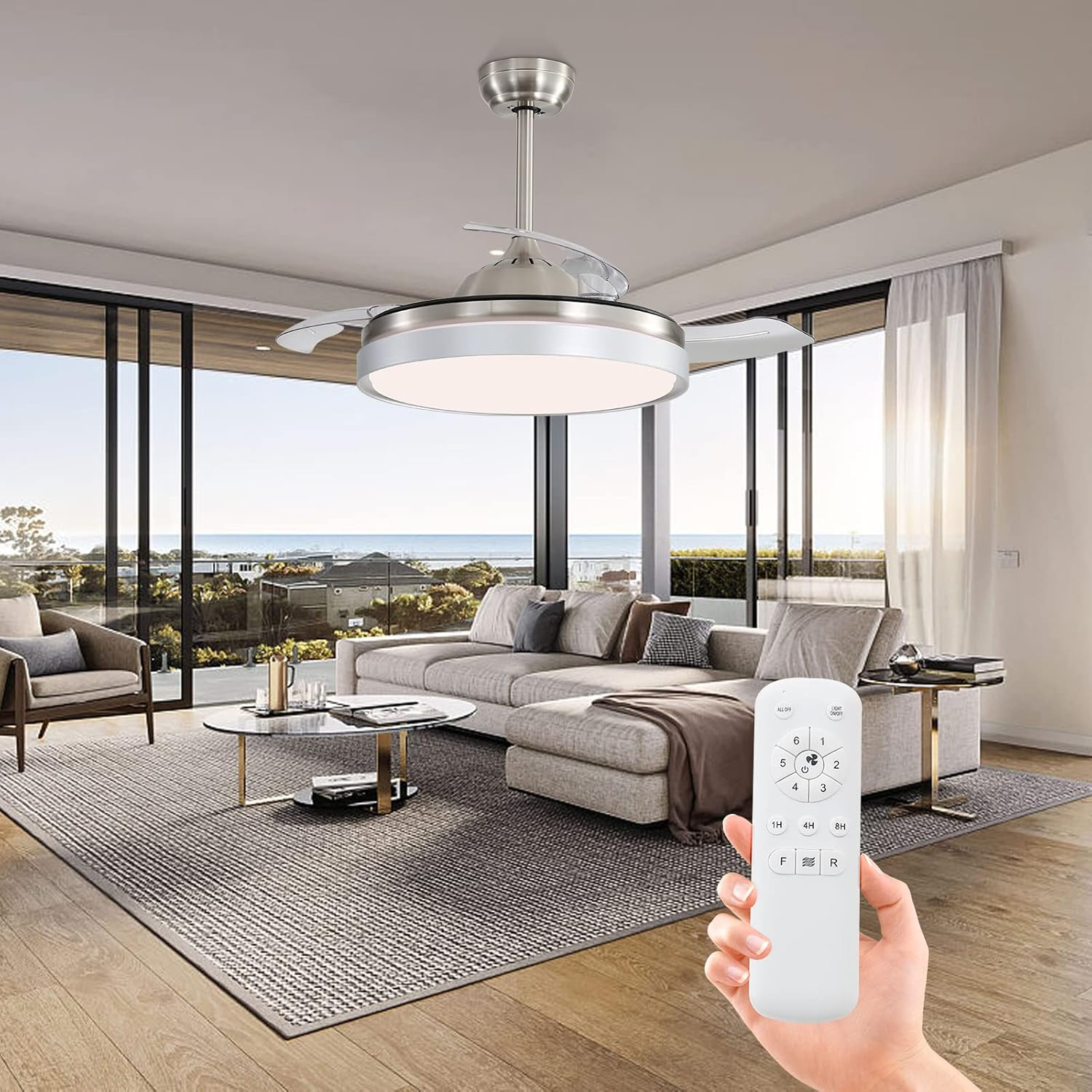 • Fanii cu ajutorul multi-funcționare a telecomenzii care se află cu lumini este echipat cu o telecomandă multifuncțională, susțin 6 viteze ale ventilatorului, setarea de sincronizare (1H/4H/8H), 3 temperatură de culoare reglabilă, ventilatorul de tavan cu lumină are funcția de flux de aer invers, care poate aduce răcoare în timpul verii și poate crește circulația aerului în timpul iernii. Toate pot fi controlate prin telecomandă cu ușurință.Lantul ar trebui să aibă o capacitate minimă de încărcare de 16kg pentru instalarea ventilatorului