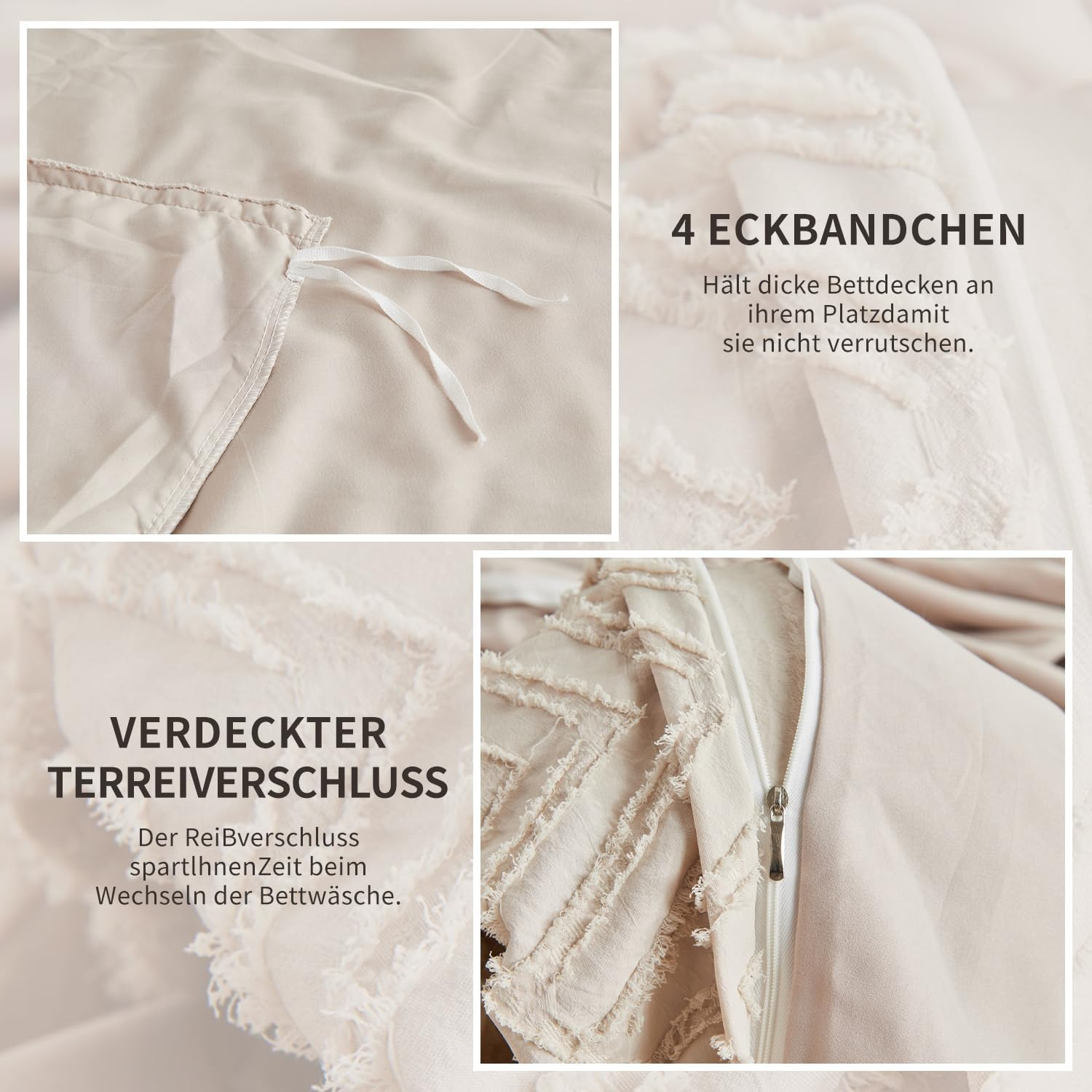 Design unic: Acest set de capace de plapumă se distinge prin designul său unic, împodobit cu broderii rafinate cu smocuri. Aduce o notă de eleganță rafinată și lux în camera dvs., transformându-se în fiecare noapte într-o experiență opulentă și confortabilă.