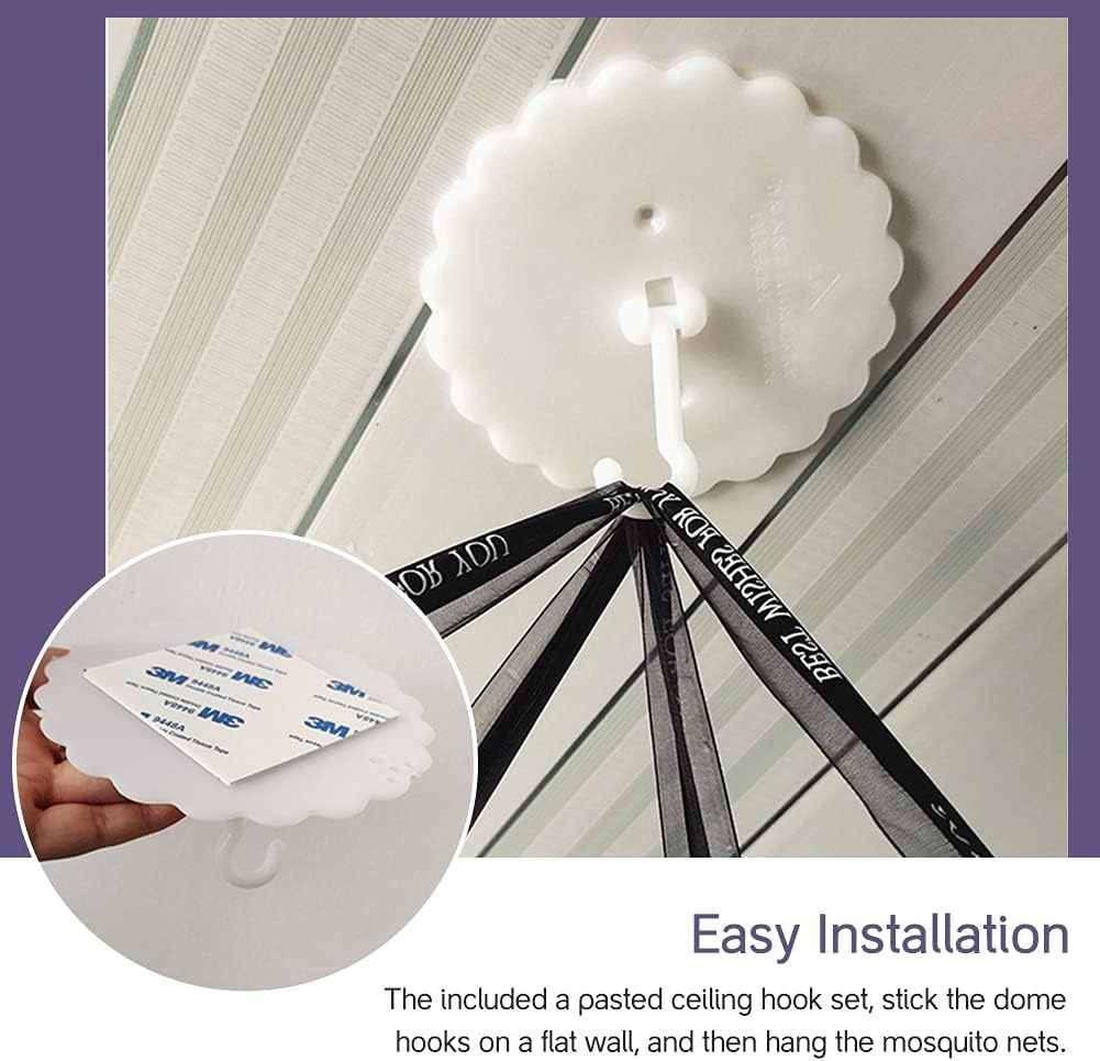 UȘOR DE INSTALAȚIE - Setul de cârlig de tavan inclus este lipit pentru a atașa cârligele de cupolă pe un perete plat și apoi atârnă plasele de țânțari. Cârligele sunt robuste și durabile și ușor de instalat. Dacă există probleme cu plasa țânțarilor, vă rugăm să nu ezitați să ne contactați. Vă vom oferi cele mai bune servicii pentru a vă asigura satisfacția de 100%.