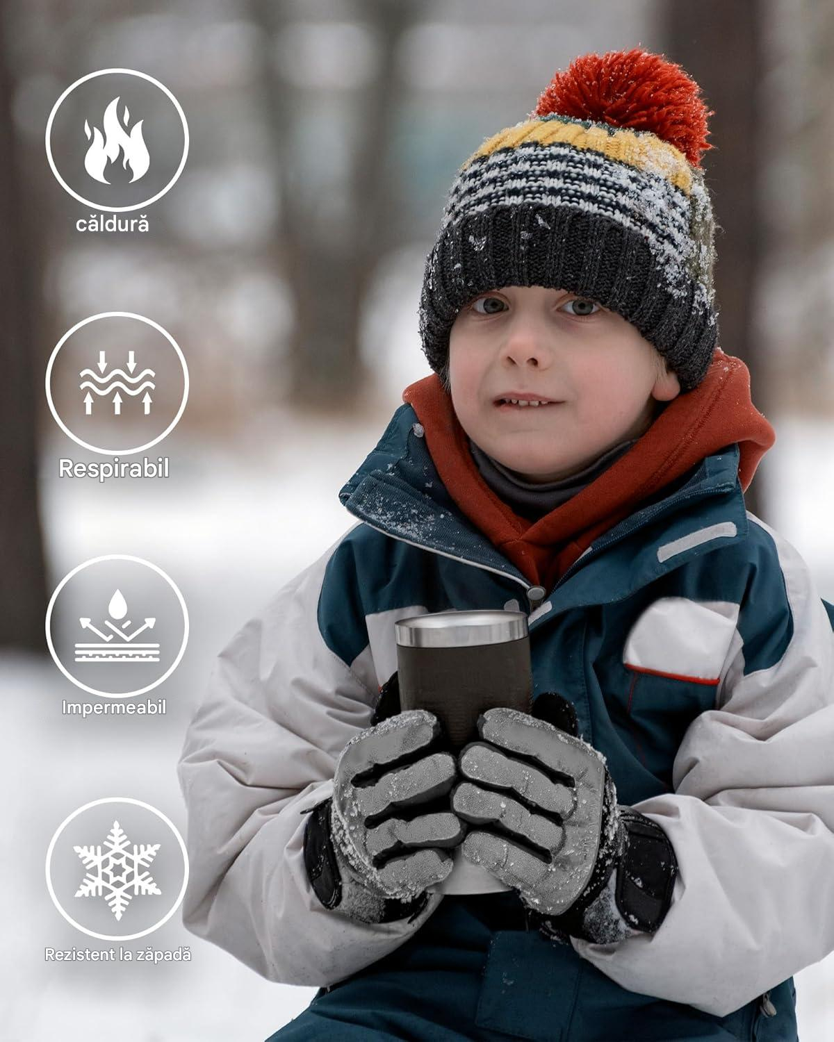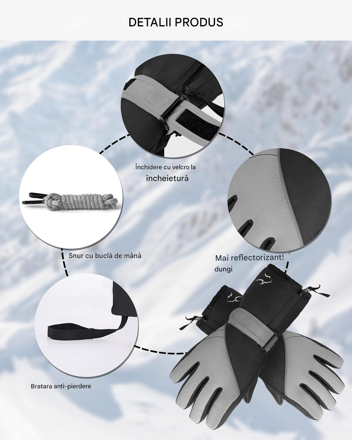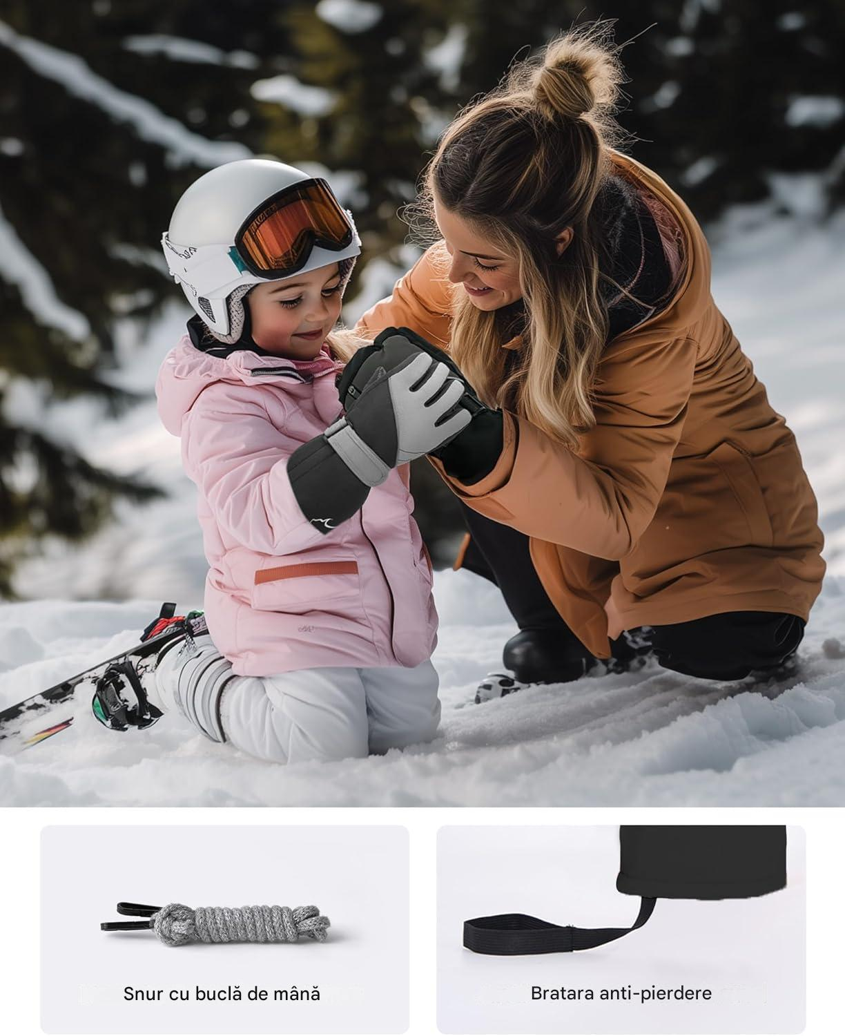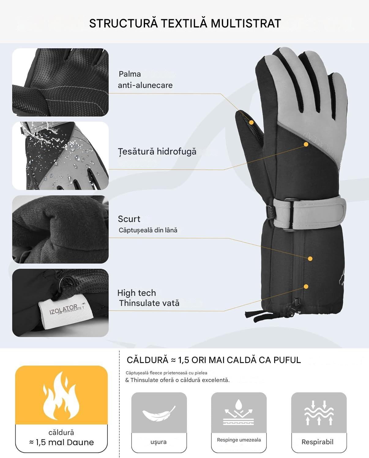 IZOLOF & BREATHABLE Mănușile noastre de zăpadă pentru băieți și fete dispun de o coajă de poliester cu densitate mare, combinată cu o membrană TUPU impermeabilă și respirabilă la suprafață. Această combinație vă protejează mâinile de umiditate, permițând în același timp transpirației și căldurii să scape, menținând mâinile uscate și confortabile în timpul plăcerii de schi.