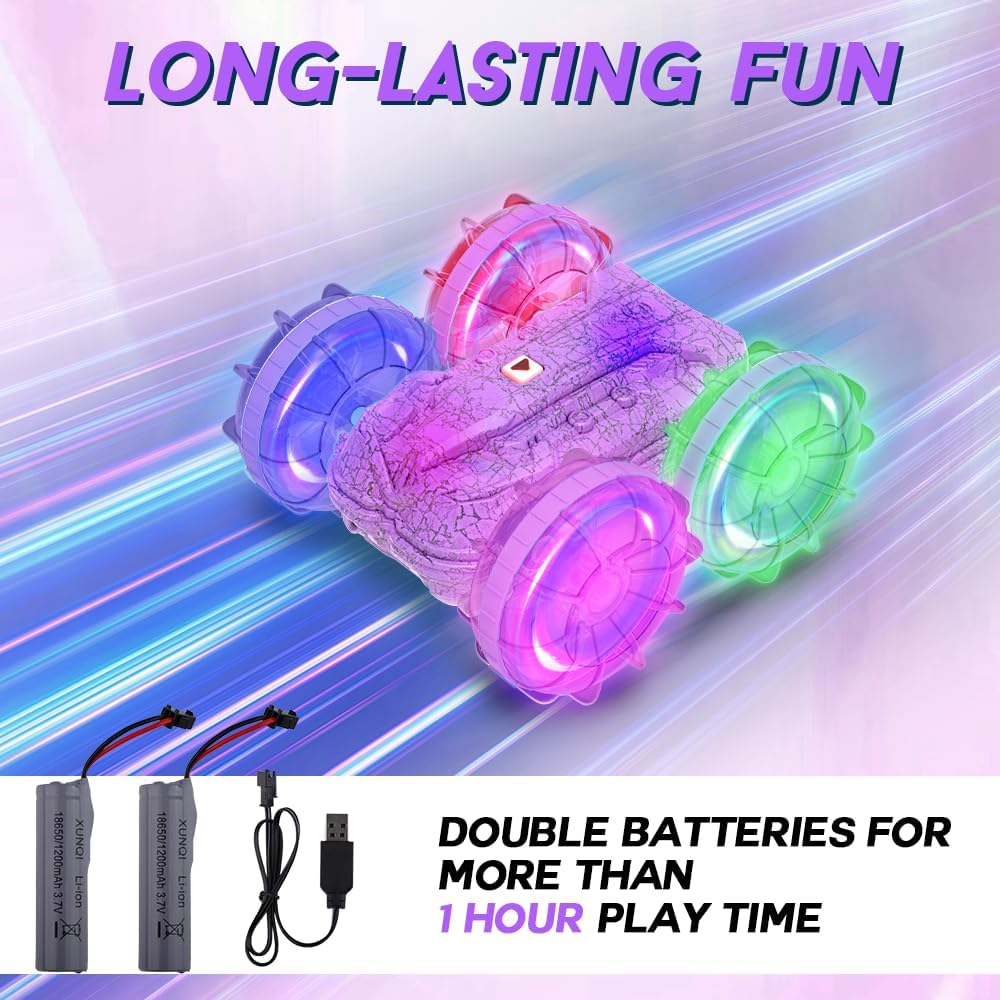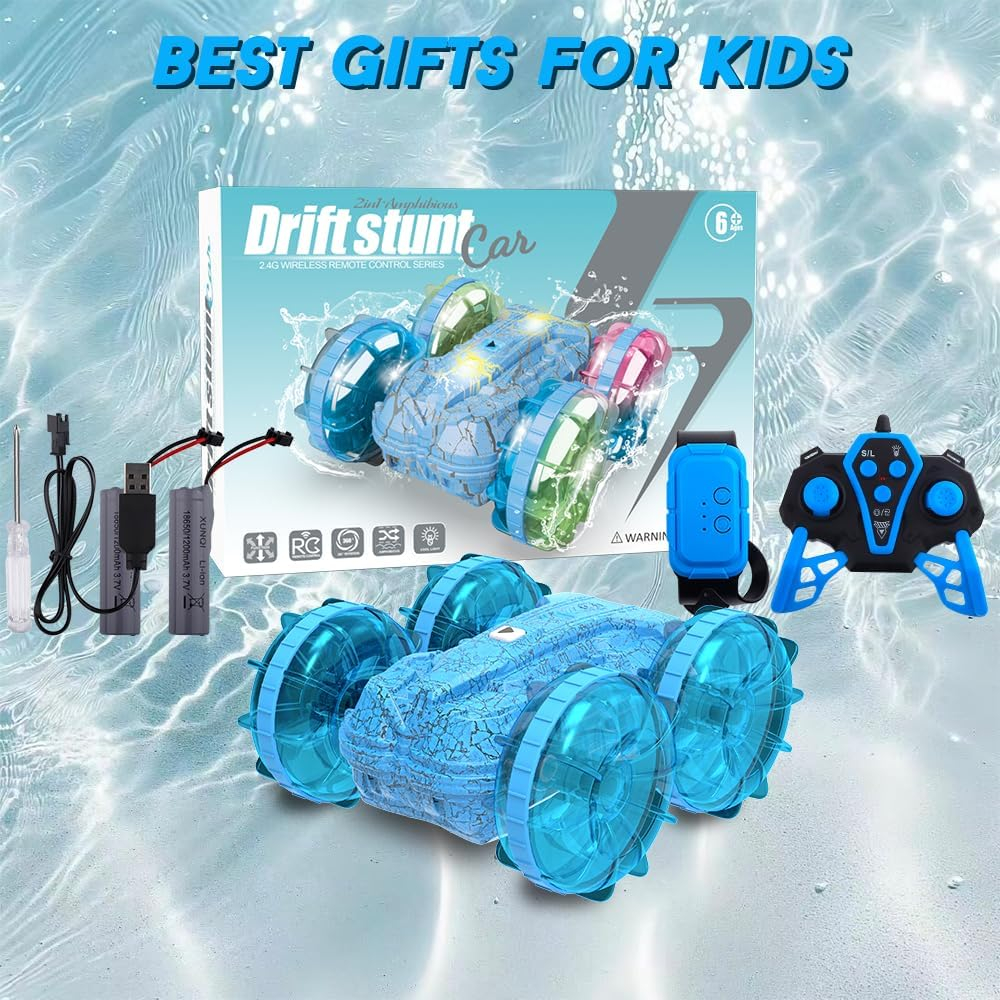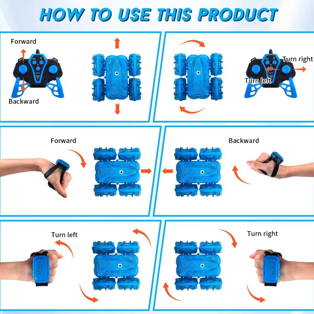 • Mașină de cascadorie RC amfibie care navighează pe apă: mașina de control de la distanță a gesturilor nu este doar o mașină de curse de țară, ci poate naviga și pe apă! Fotografiere înainte și inversă, rotații de 360 de grade pe apă și pe sol. Datorită designului bine sigilat, este rezistent la apă și intemperii și poate face față oricărei situații extreme. Mașina RC cascador vine cu un ceas controlat prin gesturi. Băieții și fetele cu vârsta cuprinsă între 4-8-12 ani pot controla mașina manual și pot efectua fără efort cascadorii de 360 de grade prin mutarea brațului sau prin rotirea încheieturii mâinii. Cu lumini LED captivante care strălucesc prin roți clare, mașina arată și mai impresionantă. Încărcare USB și peste 80 de minute de funcționare: Distracție nesfârșită! Barca noastră auto amfibie RC conține două baterii reîncărcabile de 1200 mAh care oferă un timp de joc incredibil de 2 ore. Încărcarea USB convenabilă și protecția prin supraîncărcare încorporată asigură o încărcare sigură și convenabilă. Cu sistemul său avansat de telecomandă de 2,4 GHz, mașina noastră RC oferă un control fără probleme și receptiv și asigură o experiență de joc interesantă și lină. Este cea mai bună jucărie de apă pentru băieții cu vârsta cuprinsă între 3-5-7 și 9 ani. RC cascadează mașina pentru piscină: în plus față de abilitățile de bază pe care ar trebui să le aibă mașinile normale de control de la distanță, această mașină poate efectua rotații de 360 de grade la locul lor și poate conduce pe ambele părți. Atunci când mașina lovește un mic obstacol, utilizați telecomanda pentru a rula mașina sau pentru a conduce pe ambele părți pentru a depăși cu ușurință obstacolele. Această funcție poate, de asemenea, să vireze brusc înapoi în modul de mișcare rapidă pentru a transforma instantaneu mașina de jucărie într-o mașină de dans. Amabila noastră atmosferică RC se deplasează liber pe toate tipurile de teren, cum ar fi lacurile, plajele, zăpada și pajiștile. Distrați-vă împreună cu părinții și copiii. Mașină RC amfibie sigură: plastic de înaltă calitate și imprimare adecvată pentru a se asigura că materialul este sigur. Mașina este echipată cu zeci de șuruburi și componente electronice de înaltă calitate pentru a asigura structura mașinii în siguranță. Este mai potrivit pentru copiii dvs. Funcția impermeabilă complet sigilată asigură durata de viață a mașinii controlate de la distanță. CADOURI PERFECTE PENTRU COPII Mașina cu plasament impermeabil dublu pentru orice teren este cel mai bun cadou pentru toți pasionații de navigație, motor, jet și barcă de viteză la zile de naștere, aniversări, adio, cele mai bune urări