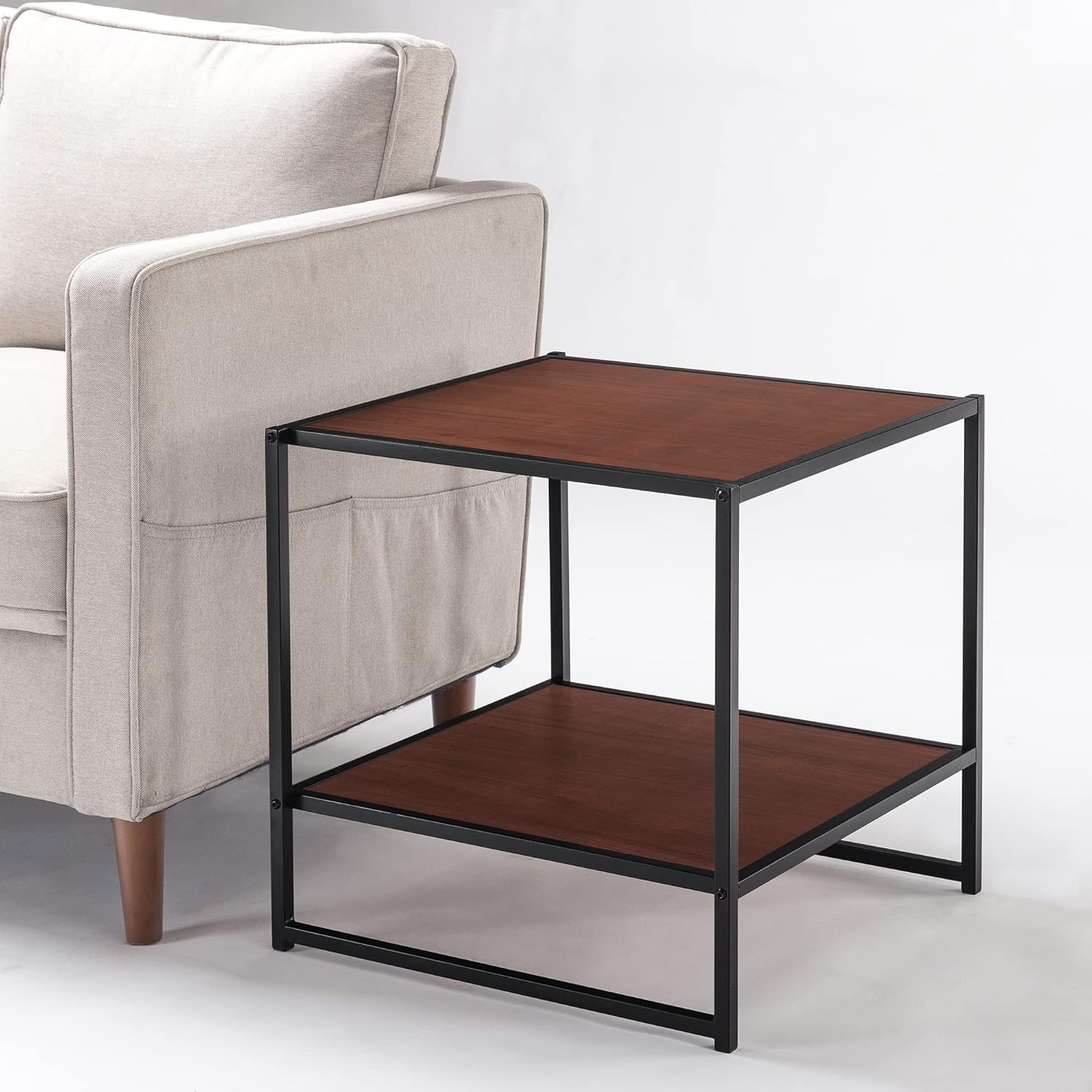 Măsuță laterală de cafea, pe 2 nivele, tabli maro, cadru negru 50x50x50 cm