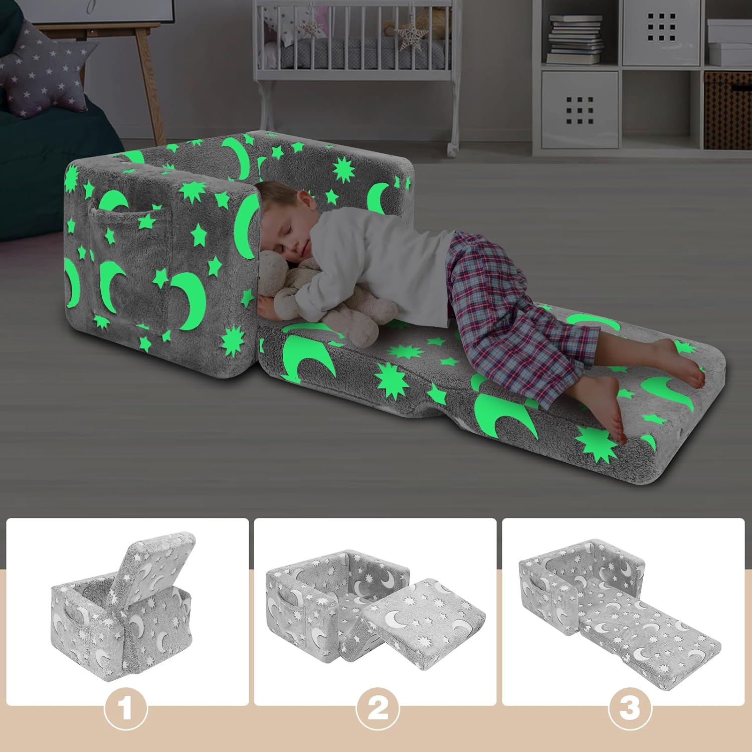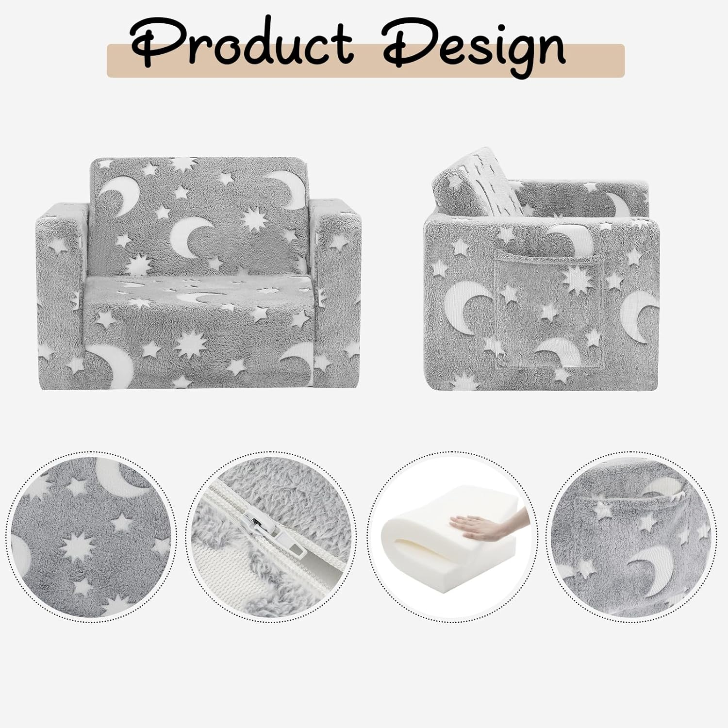 Design 2 în 1: scaun pliabil, canapeua care se transforma într-un pat pentru copii, oferind cel mai bun sentiment pentru copii atunci când stau sau doarm avand țesătură moale și 30cm spumă pufoasa de înaltă calitate..