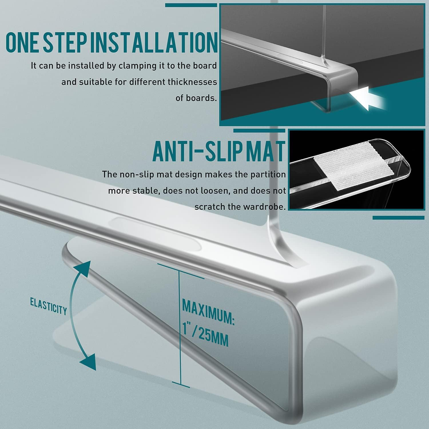• Rafturile de organizator ale cabinetului - instalare ușoară: fiecare separator de dulap clar are o dimensiune de 11,03 inci L x 7,87 inci H. Deschiderea organizatorului raftului se potrivește unei grosimi de 0,4 - 0,95 inci (deci de o grosime poate duce la fisuri). Separatoarele de rafturi acrilice sunt ușor de instalat, nu sunt necesare instrumente. Pur și simplu glisați separatoarele pe raftul dvs. și acestea rămân la locul lor fără unelte sau hardware de montare.