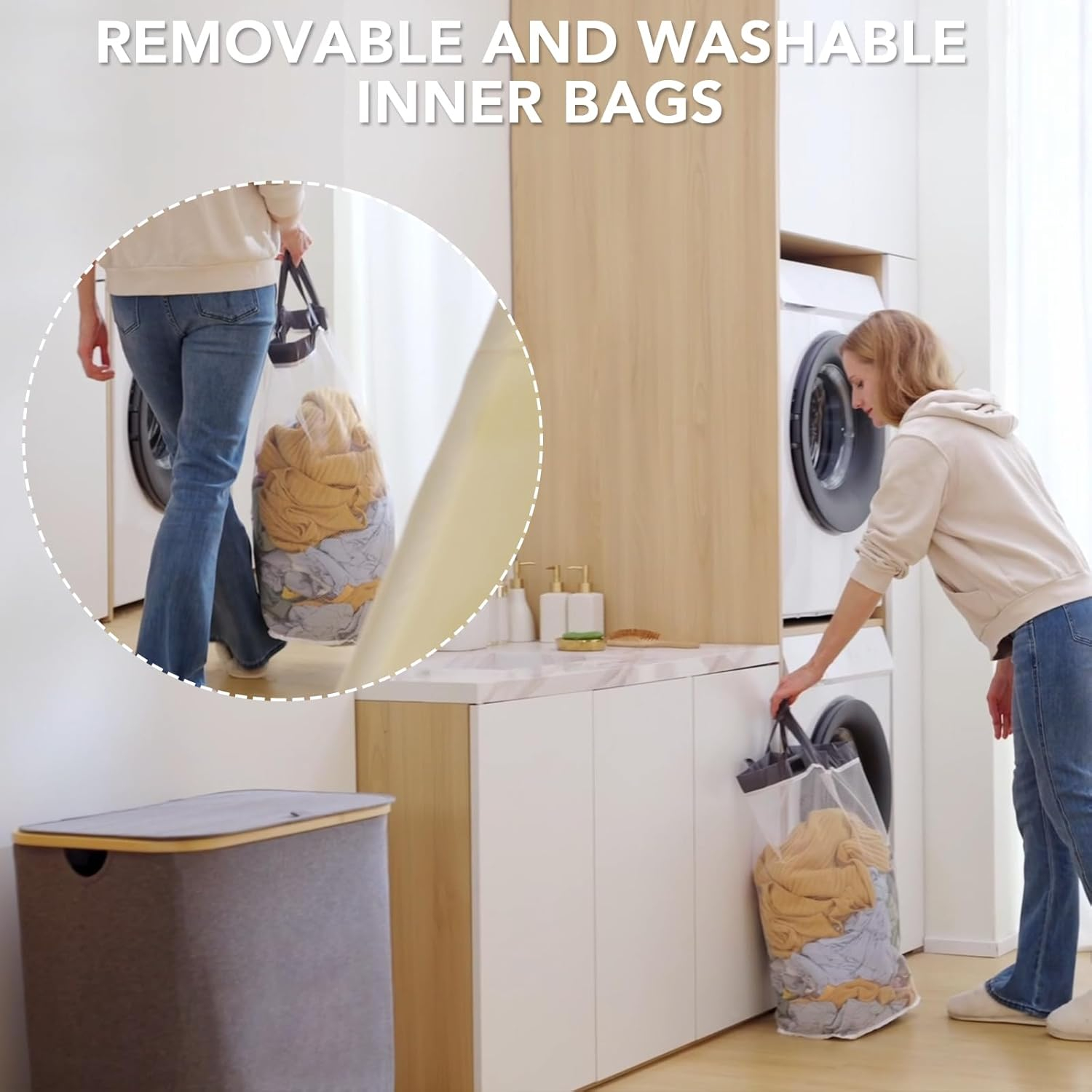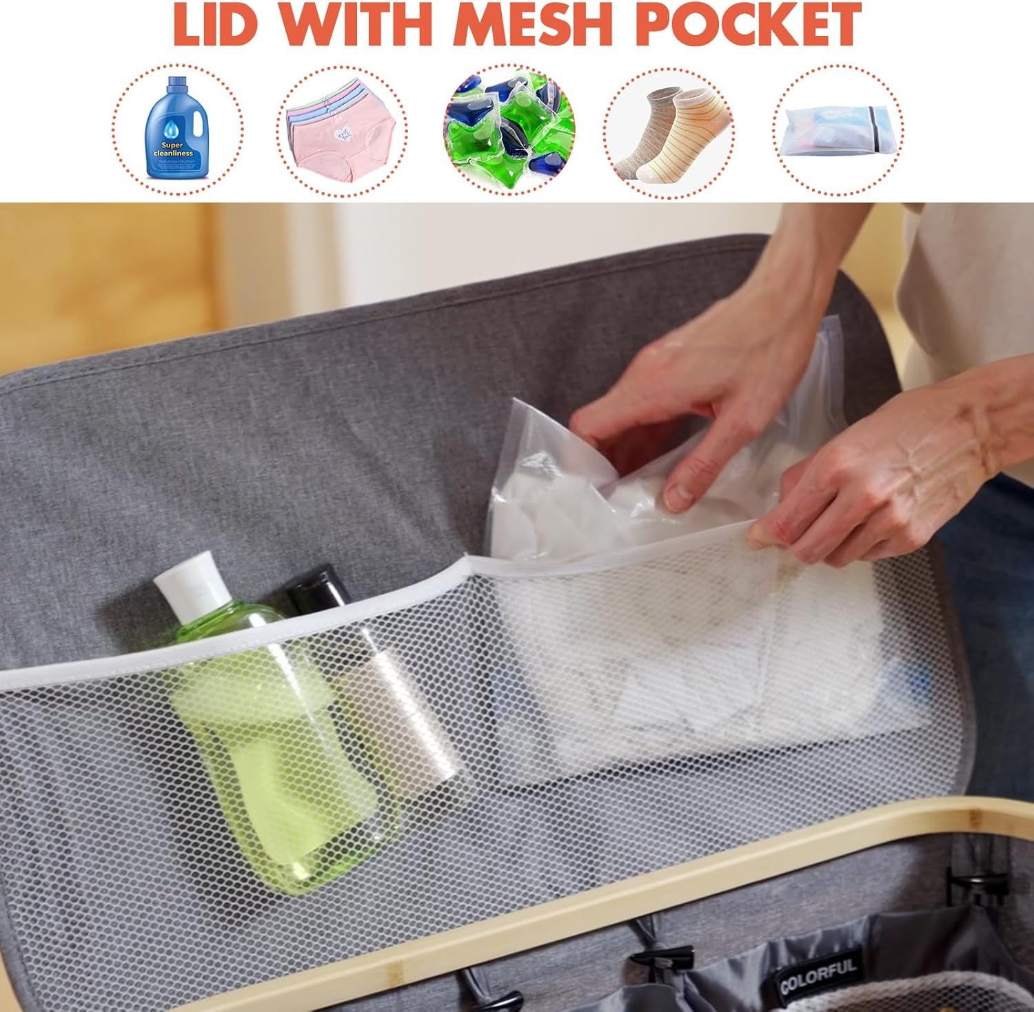 Geanta de rufe din coșul de rufe este închisă cu un nasture, fără velcro, deci nu va cădea atunci când aruncați ocazional haine sau există prea multe haine. Datorită mânerului de transport, sacul interior poate fi îndepărtat în cel mai scurt timp și transportat cu ușurință la mașina de spălat. Cu un buzunar de plasă în interiorul capacului, puteți pune o șosetă, lenjerie de corp, pungă de purificare a aerului etc.