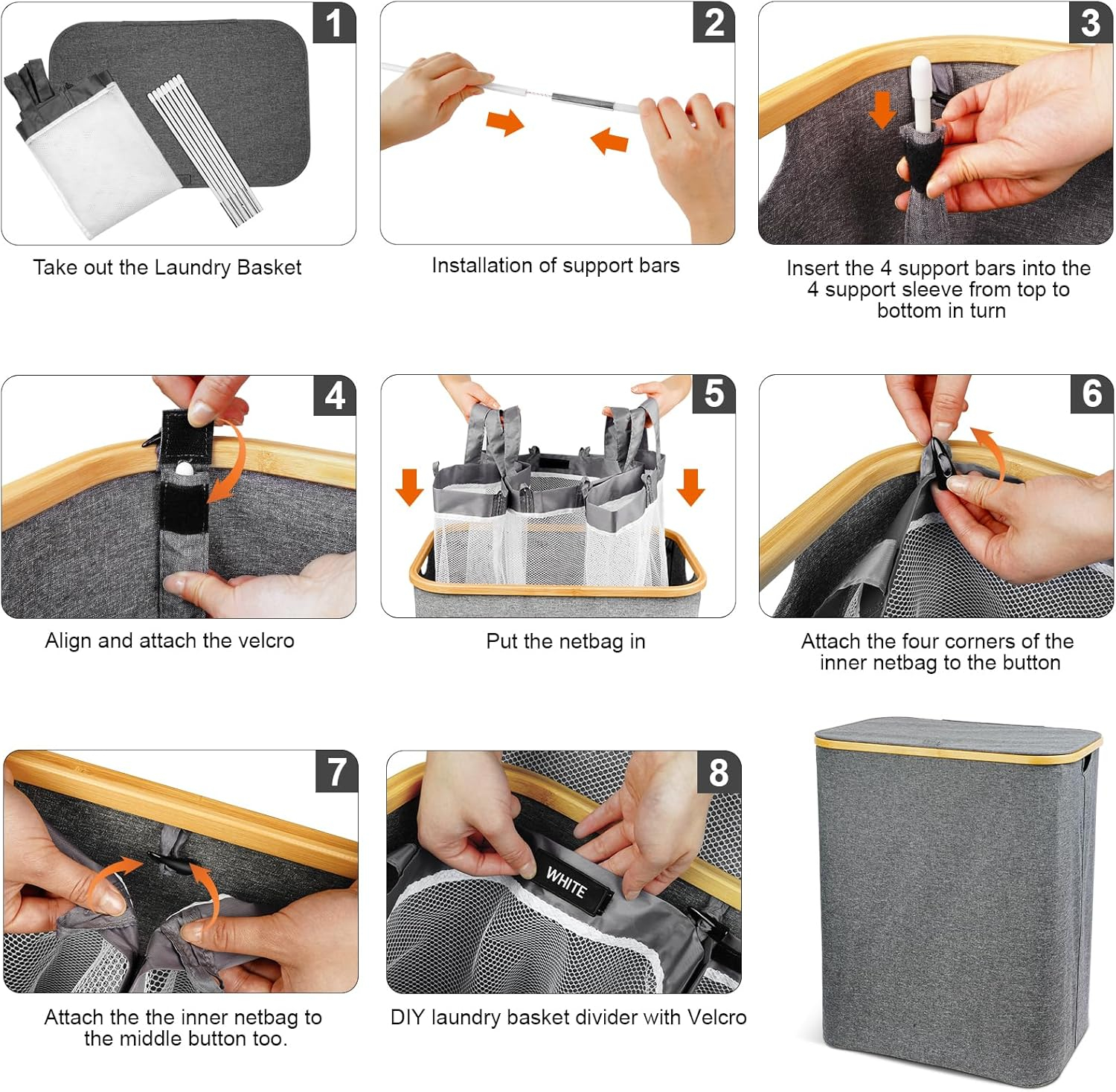 UȘOARĂ PENTRU INSTALATĂ ȘI PLIABILĂ: Pur și simplu introduceți 4 tije de susținere în tubul de inserție fixă, simplu și convenabil. Dimpotrivă, poate fi pliat și depozitat cu ușurință într-un dulap sau sertar pentru a economisi spațiu atunci când nu este utilizat. Materialul din oxford impermeabil 600D, rama ecologică din bambus și 4 tije puternice din fibră de sticlă, fără riduri, fac coșul de rufe să fie utilizat de mult timp.