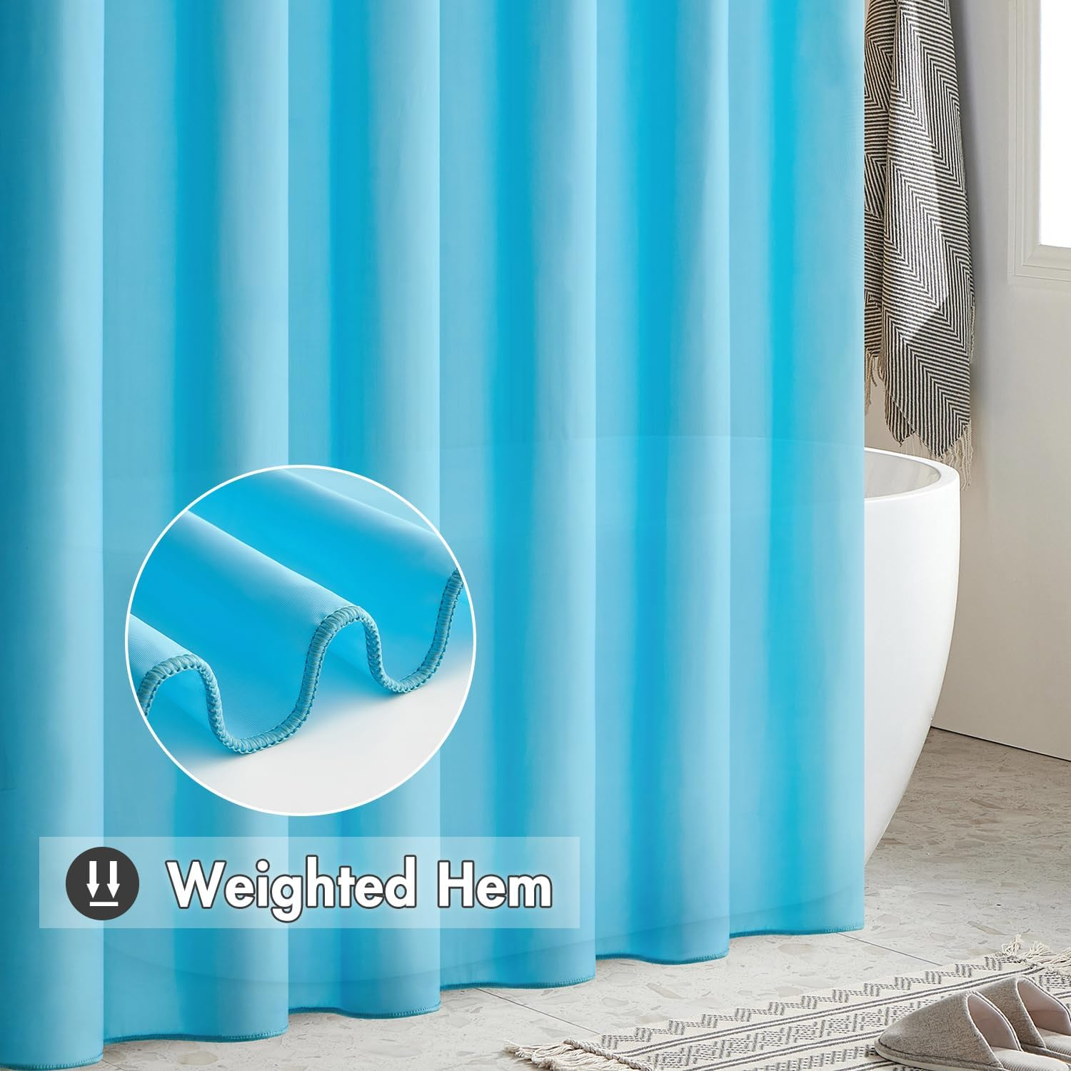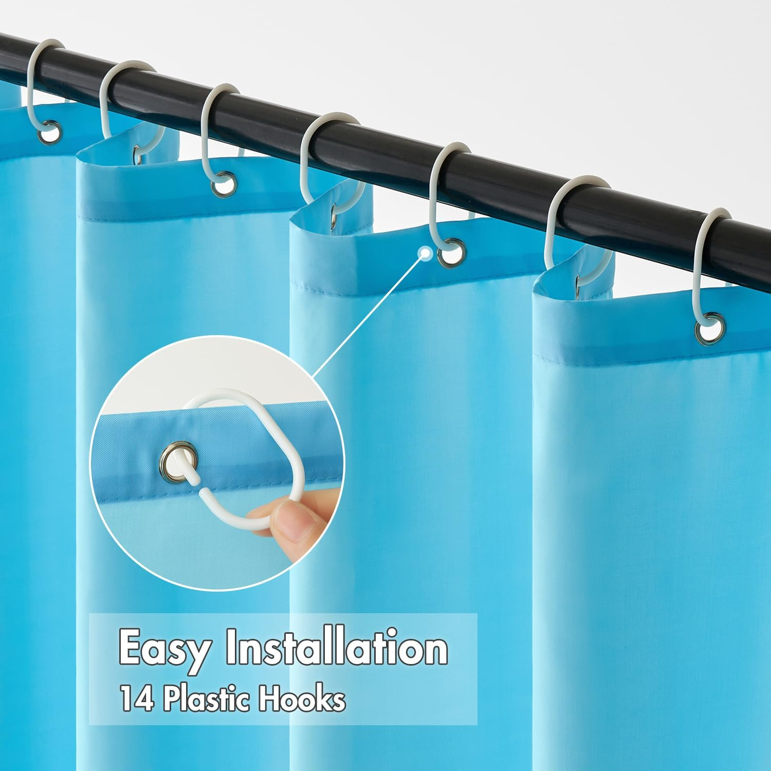 Material: poliester 100%, uscare respirabilă și rapidă, îngrijire ușoară, rezistent la muguri, rezistent la ușoară, durabil și lavabil la mașină. Gromurile metalice rezistente la rugină din partea de sus împiedică perdeaua de duș să se rupă sau să fie deteriorată.