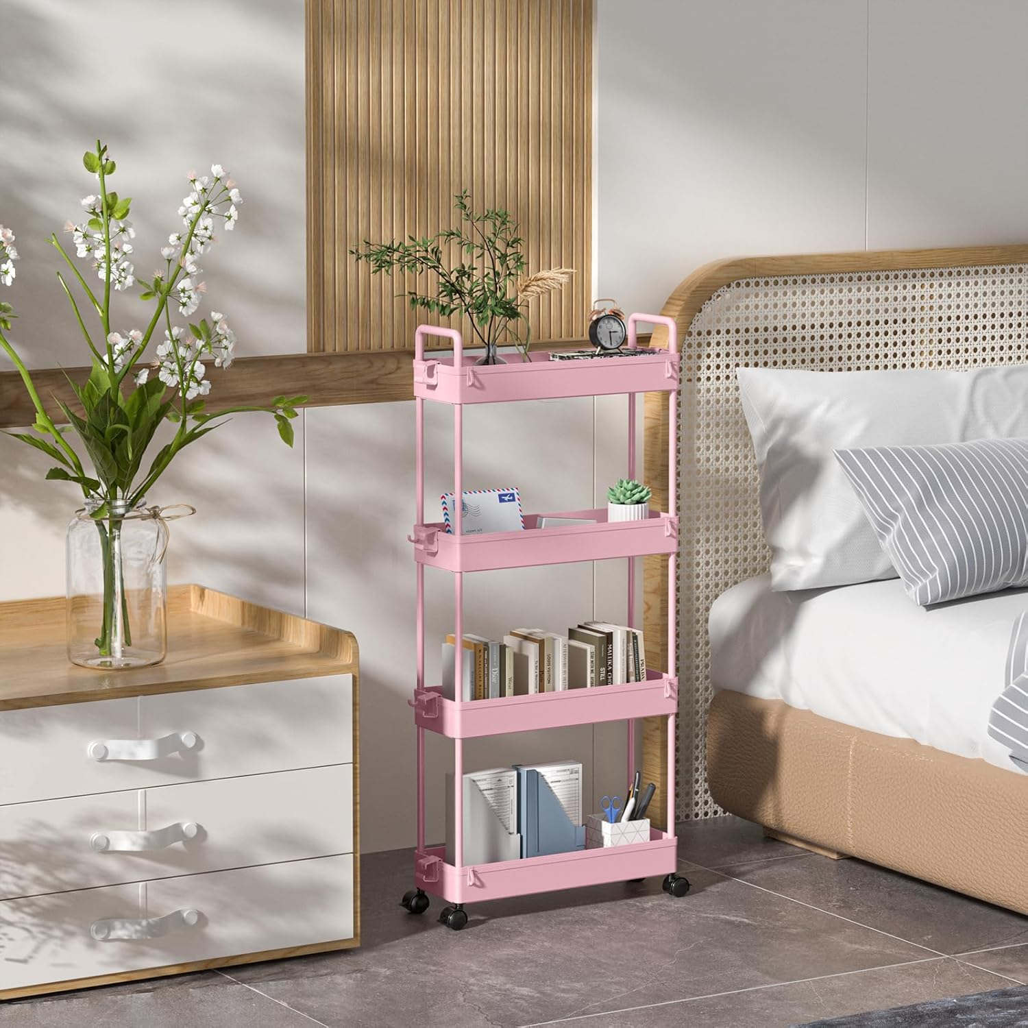 Căruciorul de depozitare a utilității rulant răspunde la toate tipurile de nevoi acasă. Utilizați-l ca cărucioare de baie, cărucioare de depozitare în bucătărie, cărucioare de masă, cărucioare de service, rafturi de depozitare, și altele. Puteți pune orice doriți, cum ar fi articole de toaletă, prosoape, artizanat, plante, detergent, unelte, alimente, produse alimentare etc. Fă-ți casa mai curată și mai ordonată.