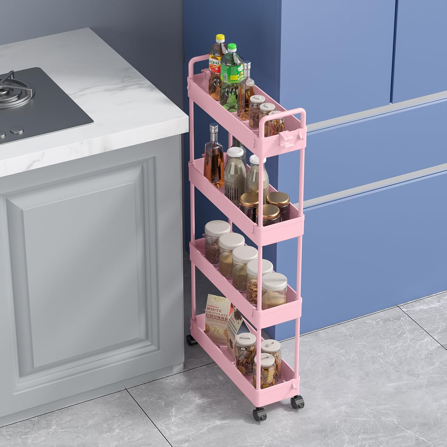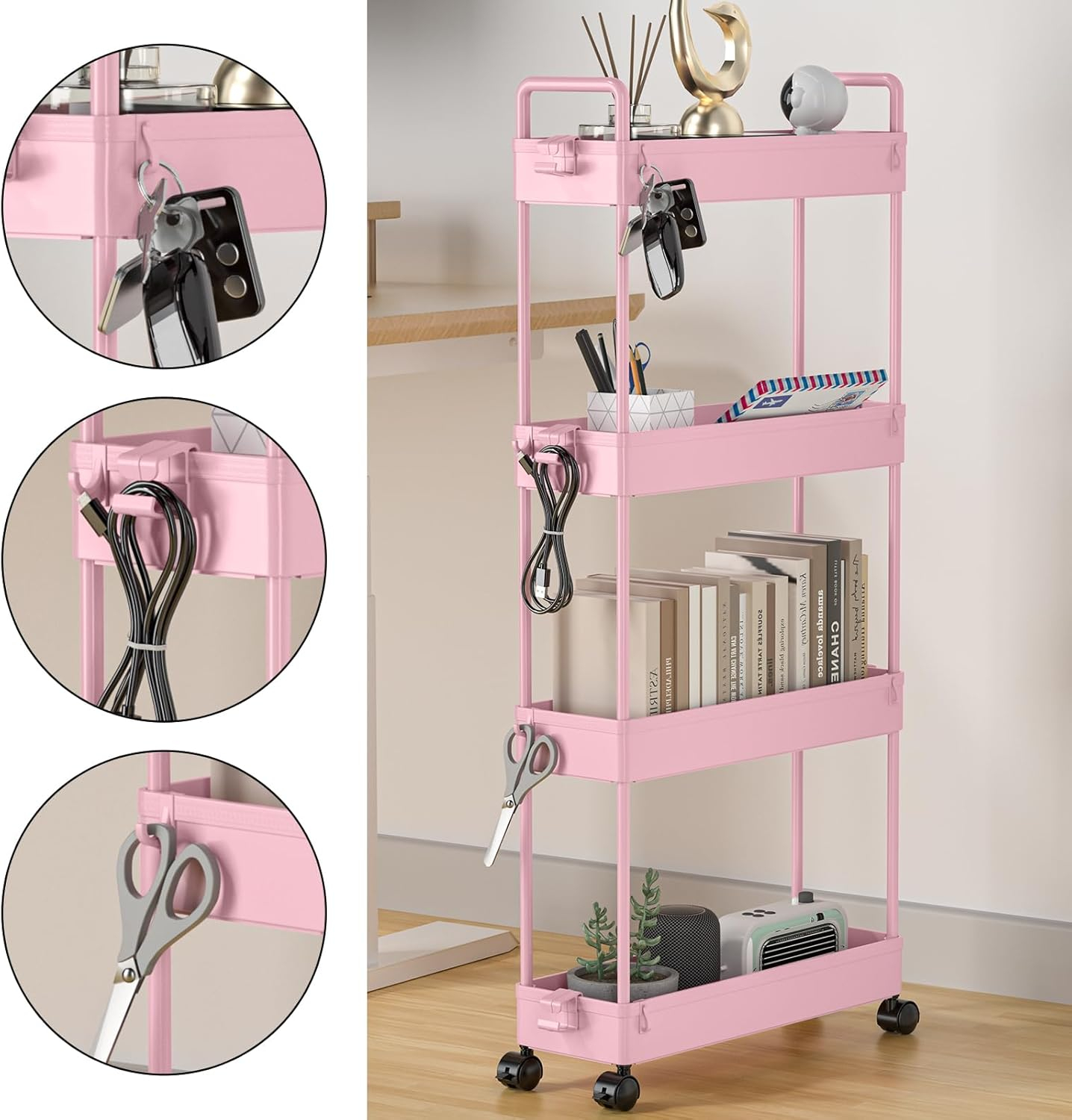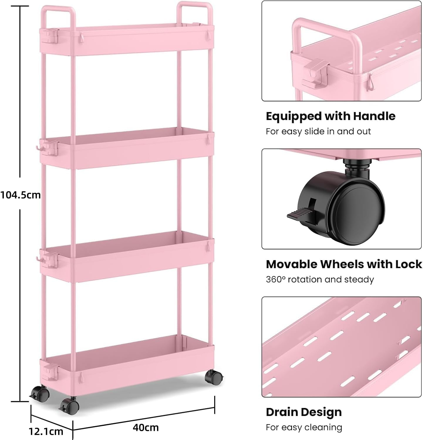 Căștile Flexible & Widely Used The 4-nivel Slim Storage, cu 4 niveluri, este perfect de bun venit pentru o utilizare îngustă. Unitatea de rafturi mobile alunecă cu ușurință între dulapuri, bucătării, băi, garaje, spălătorii, birouri, cămine, biblioteci sau între spălătorie și uscător. Ușor de depozitat și de transport. Dimensiune: 12 x 39 x 92 cm.