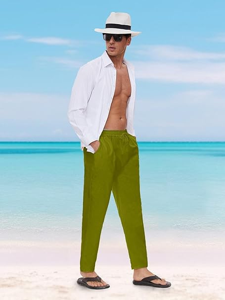 • Pantalonii casual pentru bărbați sunt confecționați din bumbac și lenjerie, o țesătură ușoară și moale, respirabilă și confortabilă de purtat pentru o lungă perioadă de timp, fără a cântări pielea.