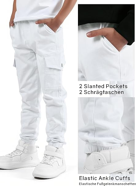 STIL CLASIC: Fundurile de jogging cargo ale băieților sunt disponibile în negru, alb și kahki și pot fi combinate cu toate tricourile, bluzele de trening și hanorace pentru un stil relaxat!