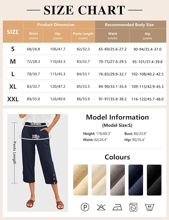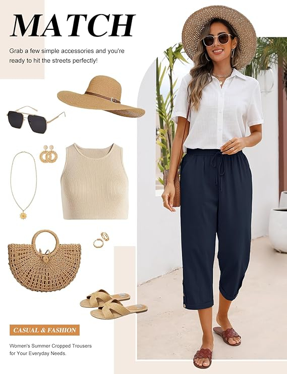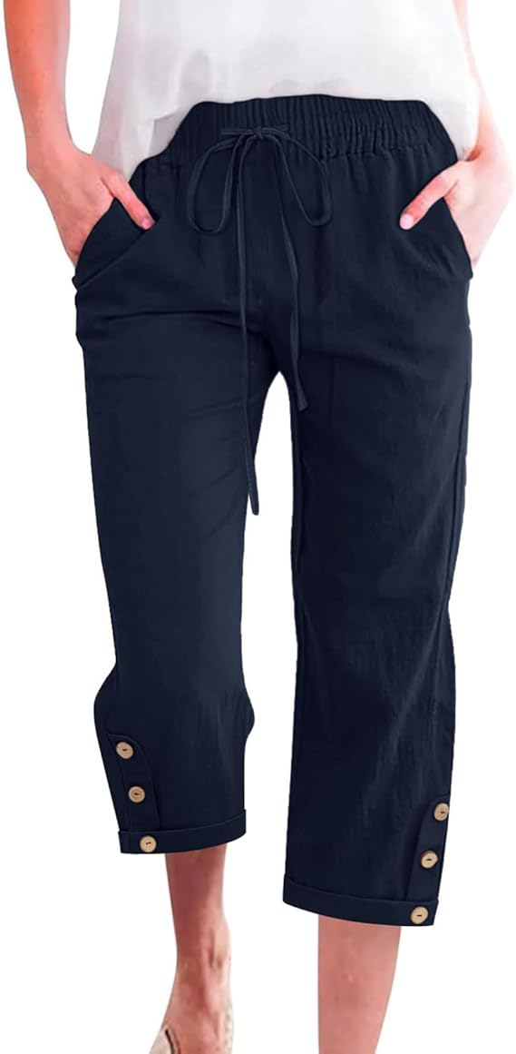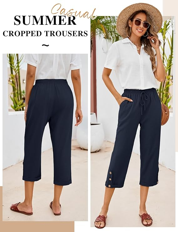 Pantaloni de bumbac: Se potrivesc relaxat cu talie elastică și cravată de șnur asortată, acești pantaloni moi de lungime de trei sferturi, cu două buzunare laterale, pot fi trași cu ușurință și pot arăta grozav toată ziua.