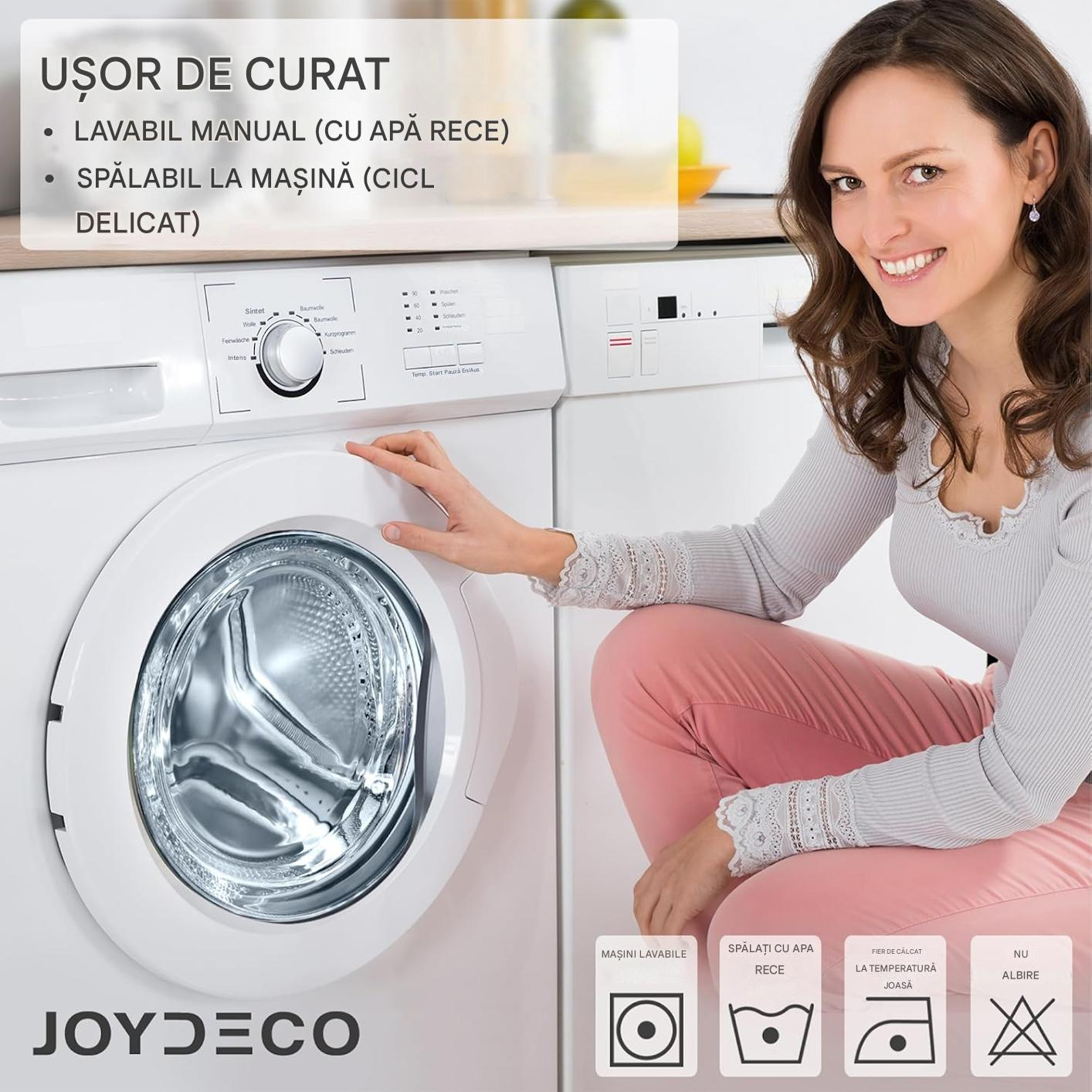 • Material: Perdelele de bucătărie Joydeco cu ochi pentru camera pentru dormitor sunt realizate din poliester 100% și sunt lavabile la mașină. Vă rugăm să le spălați separat într-o plasă de rufe, să nu le înălbiți, să le cărați la temperatură scăzută și să vă răsuciți uscat.