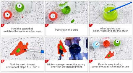 • Pigmenți de înaltă calitate: vopsirea după setul de culori setate de numere oferă o varietate de culori, vopseaua acrilică a fost testată riguros, calitate excelentă și nu se estompează cu ușurință, iar culoarea poate fi stocată pentru o lungă perioadă de timp