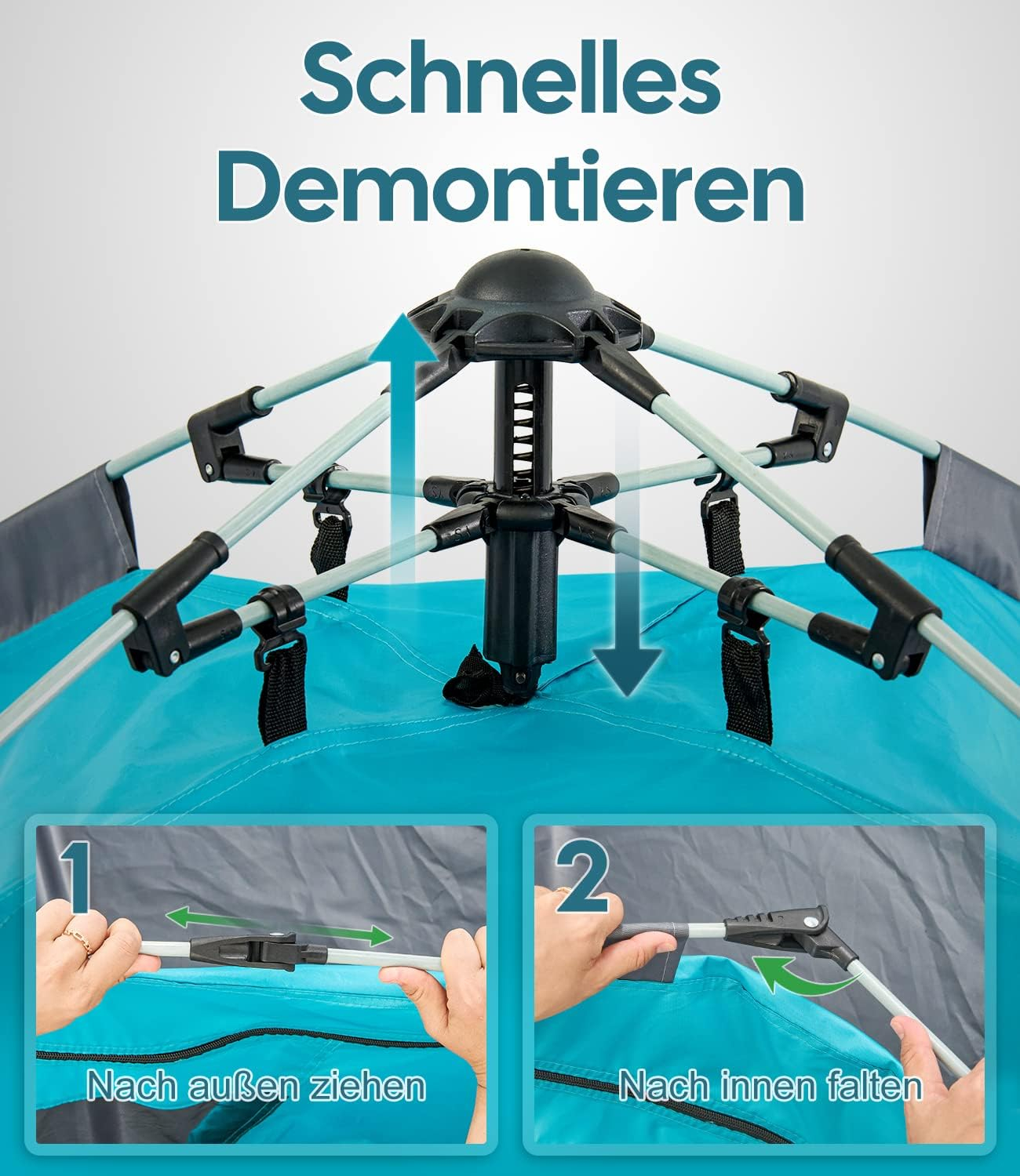 Super Stable & Durable: Noul cadru din fibră de sticlă cu stâlpi mai groși de 8.0mm este mai sigur, mai durabil și fără rugină, susținând cortul să stea stabil pe cont propriu și să-și păstreze forma după o lungă perioadă de utilizare. Cortul este echipat cu 3 saci de nisip și 4 mize pentru a asigura stabilitatea și pentru a preveni suflarea acestuia în vânt