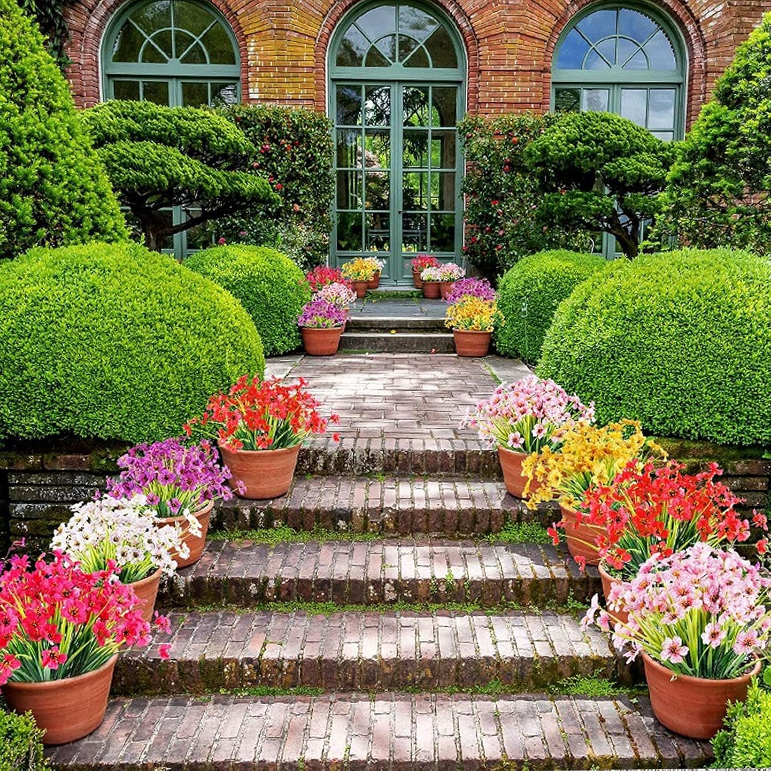 Aveti 10 buchete de flori artificiale, fiecare cu 5 tulpini îndoibile și 18 capete de flori. Acestea au, de obicei, o lungime de aproximativ 13 inci/33cm și o lățime de 12 inci/30cm. Ele pot fi, de asemenea, extinse, după cum este necesar, până la 16 inci / 40cm.