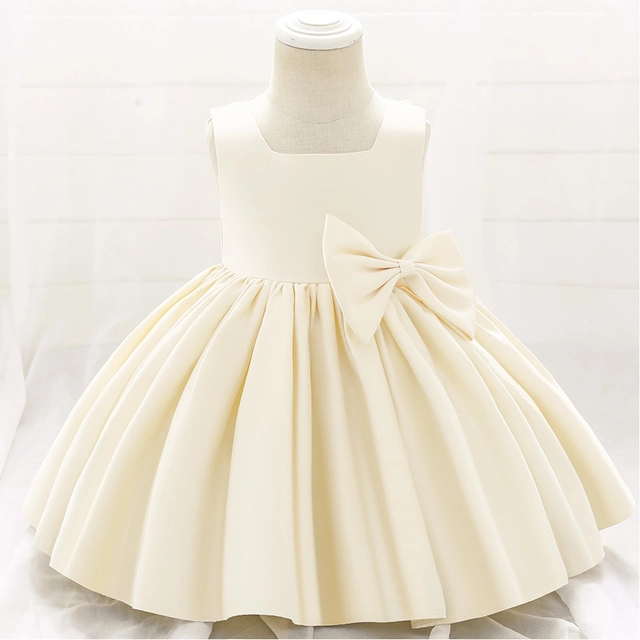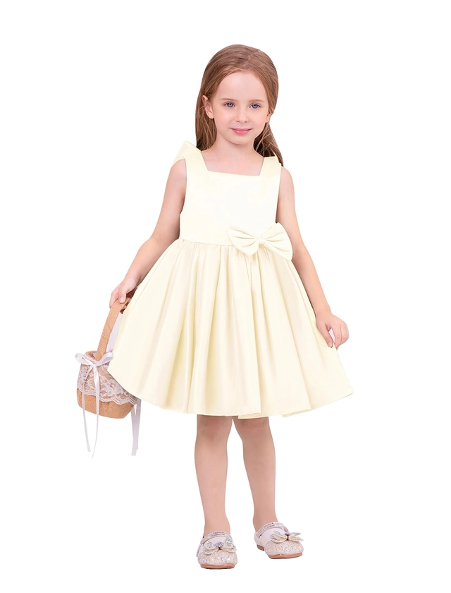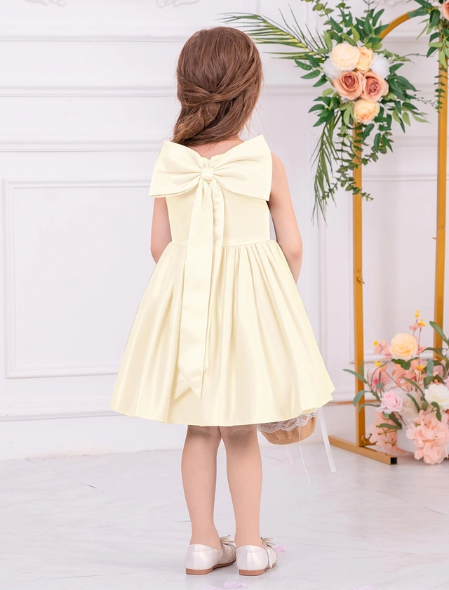 • DESIGN ELEGANT - Design elegant și elegant, rochie din satin. Gât pătrat clasic și design fără mâneci. Un arc detașabil este atașat de talie, arată atât de drăguț și fermecător. Spatele este decorat cu un arc mare detașabil, astfel încât fetița ta să devină cea mai frumoasă prințesă din mulțime. Fermoar despicat în spate