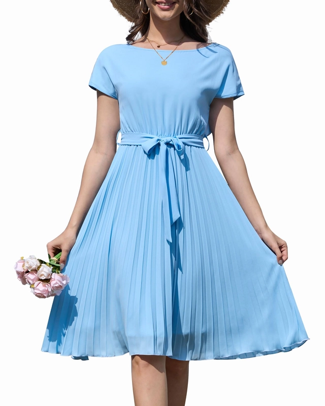 Caracteristici: Rochie elegantă, este proiectată cu un gât rotund și fustă A-line pentru a crea o siluetă măgulitoare. Rochie cu tiv plisat, rochie de vara cu maneca scurta, rochie midi, rochie la talie inalta, rochie A-line cu centura, rochie casual pe plaja, rochii cu balansare.
