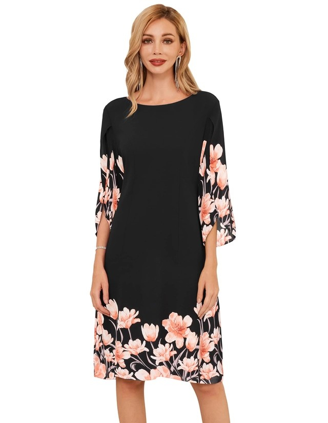 Rochie elegantapeste genunchi, mulata pe corp, mâneci 3/4, Negru cu flori roz L