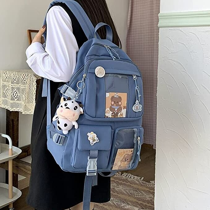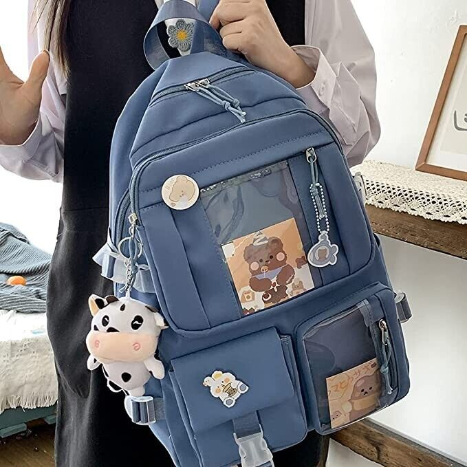 Rucsac Kawaii cu Insigne, Ghiozdan Școlar Estetic de Capacitate Mare pentru Fete Adolescente, Ghiozdan Școlar Preppy cu Buzunare Multiple și Accesorii Drăguțe