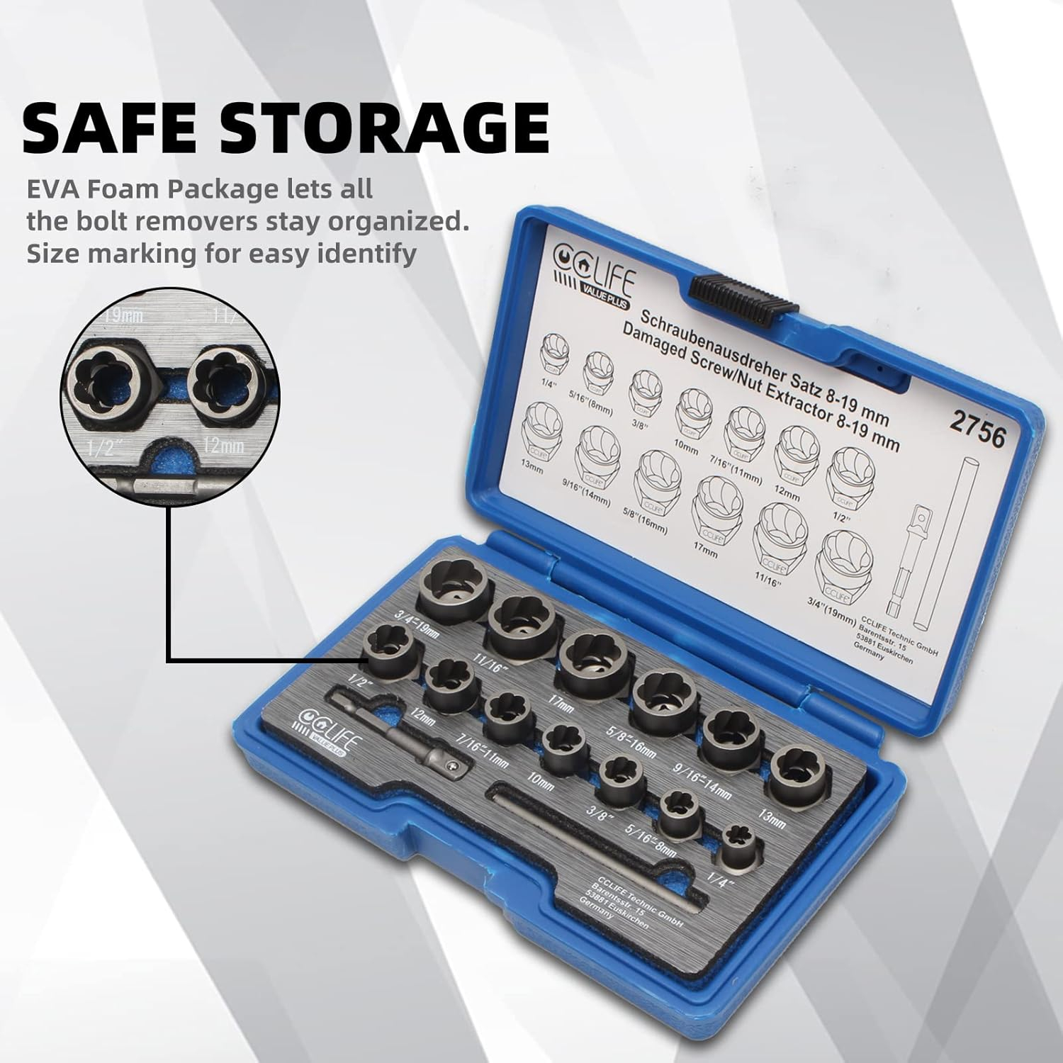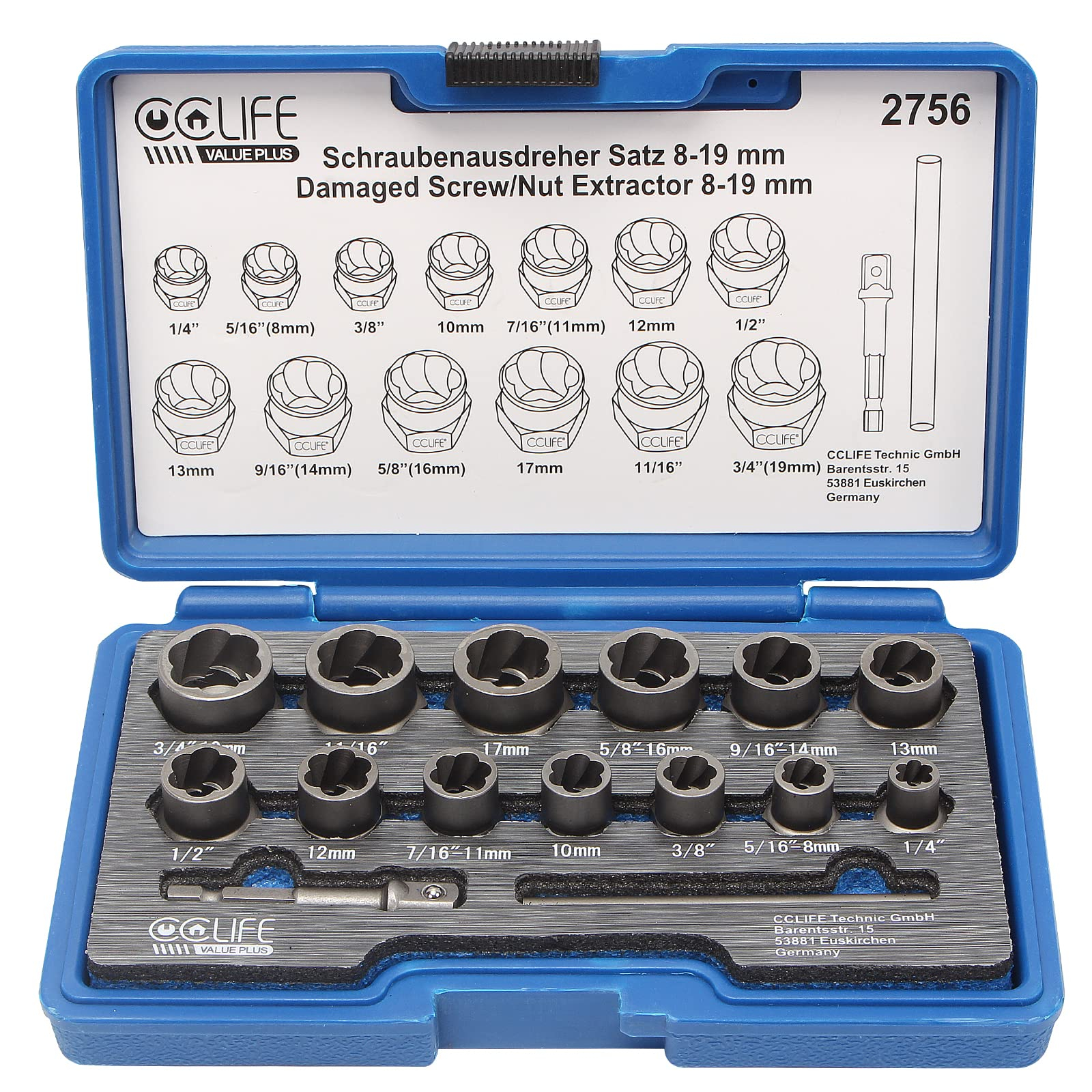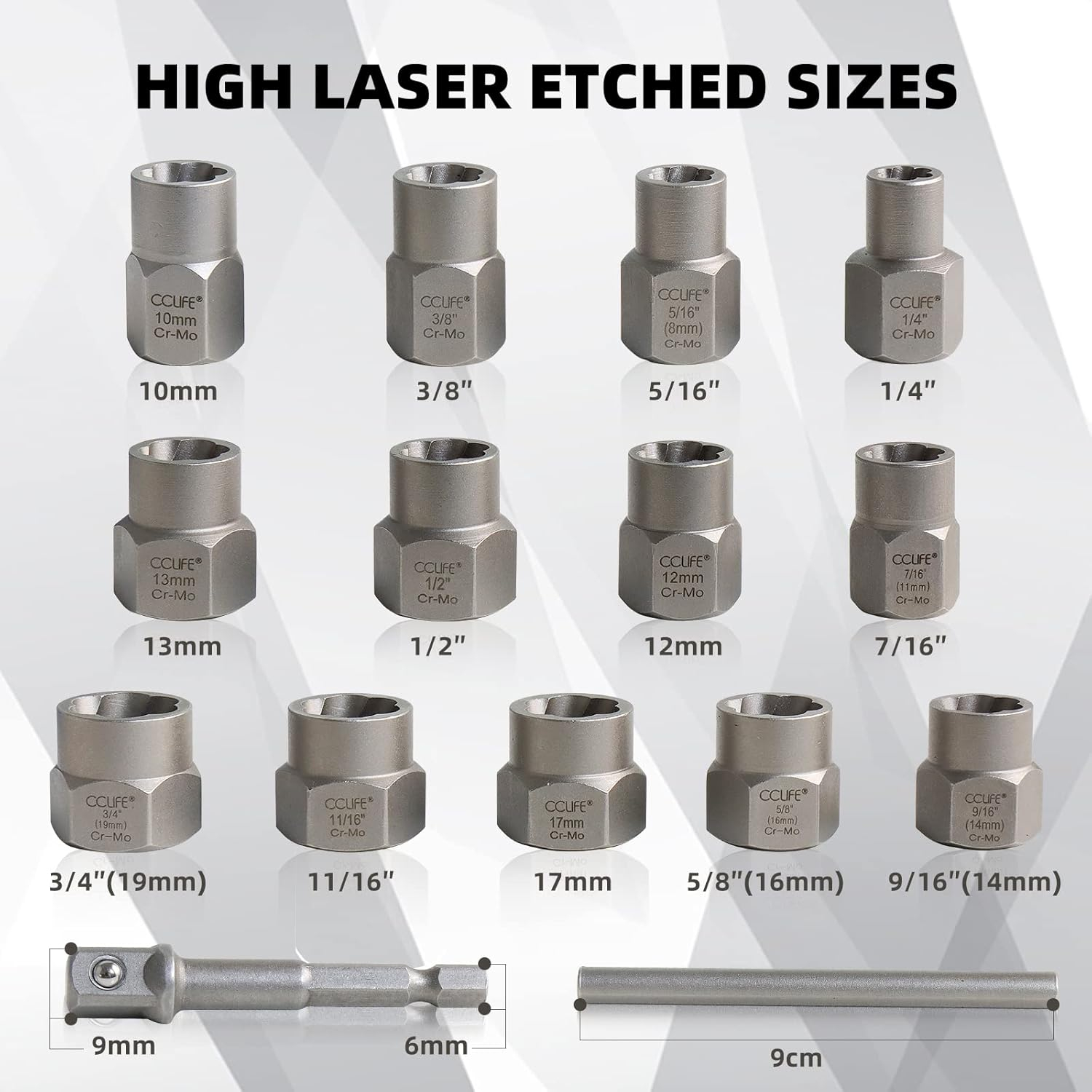 Trusa extractoare 3/8" pentru piulite si suruburi deteriorate 8-19mm 15 piese