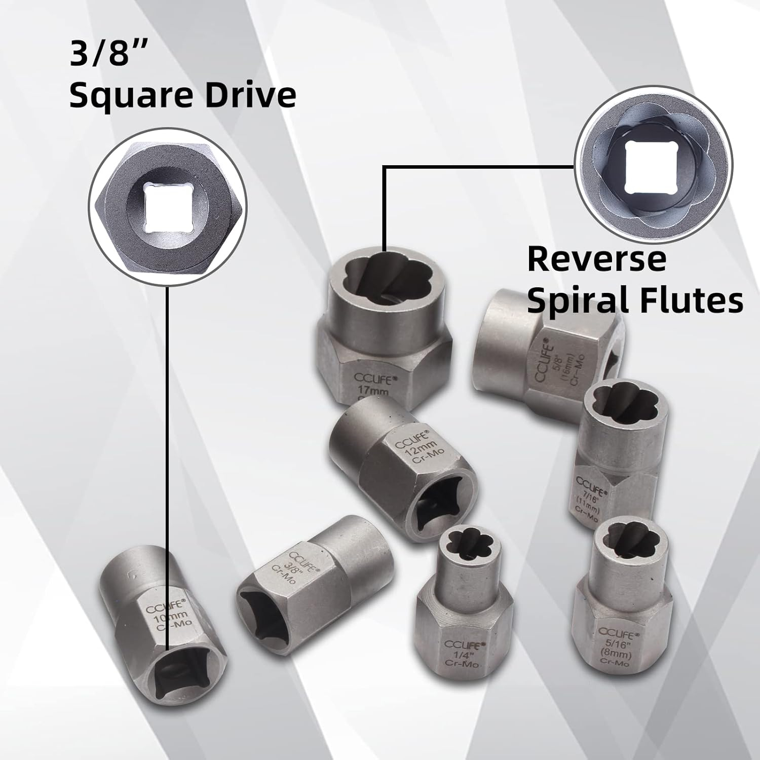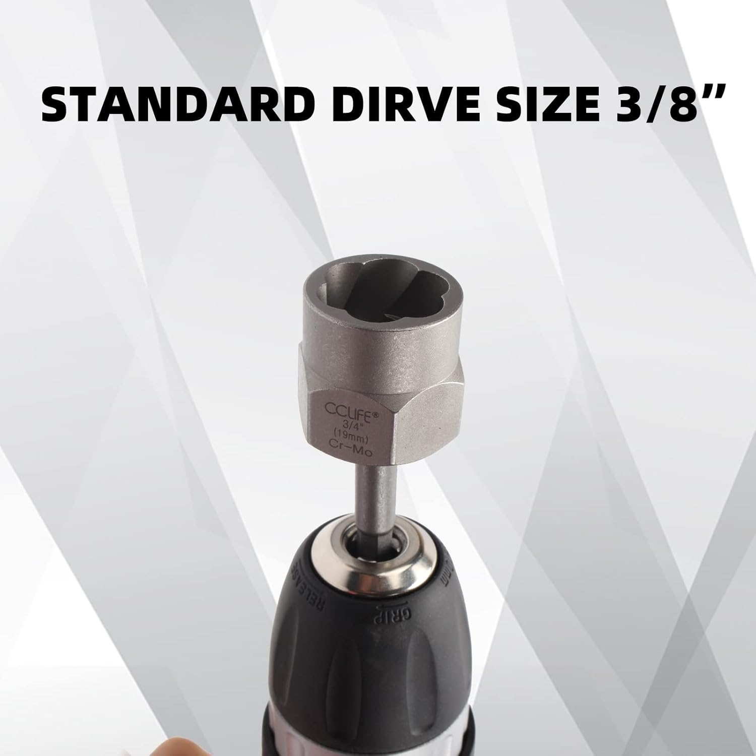 • 10 mm (3/8') drive, 1/4' - 5/16' (8mm) - 3/8' - 10mm - 7/16' (11mm) - 12mm - 1/2' - 13mm - 9/16' (14mm) - 5/8'(16mm) - 17mm - 11/16' - 3/4' (15mm)