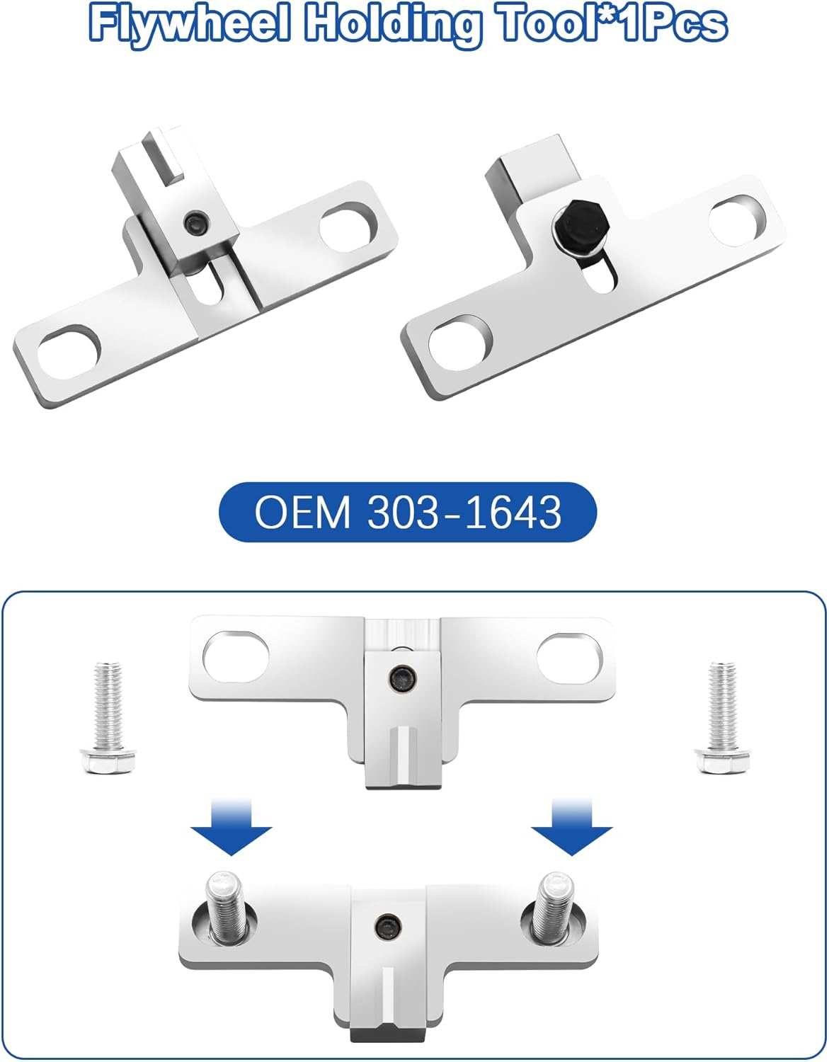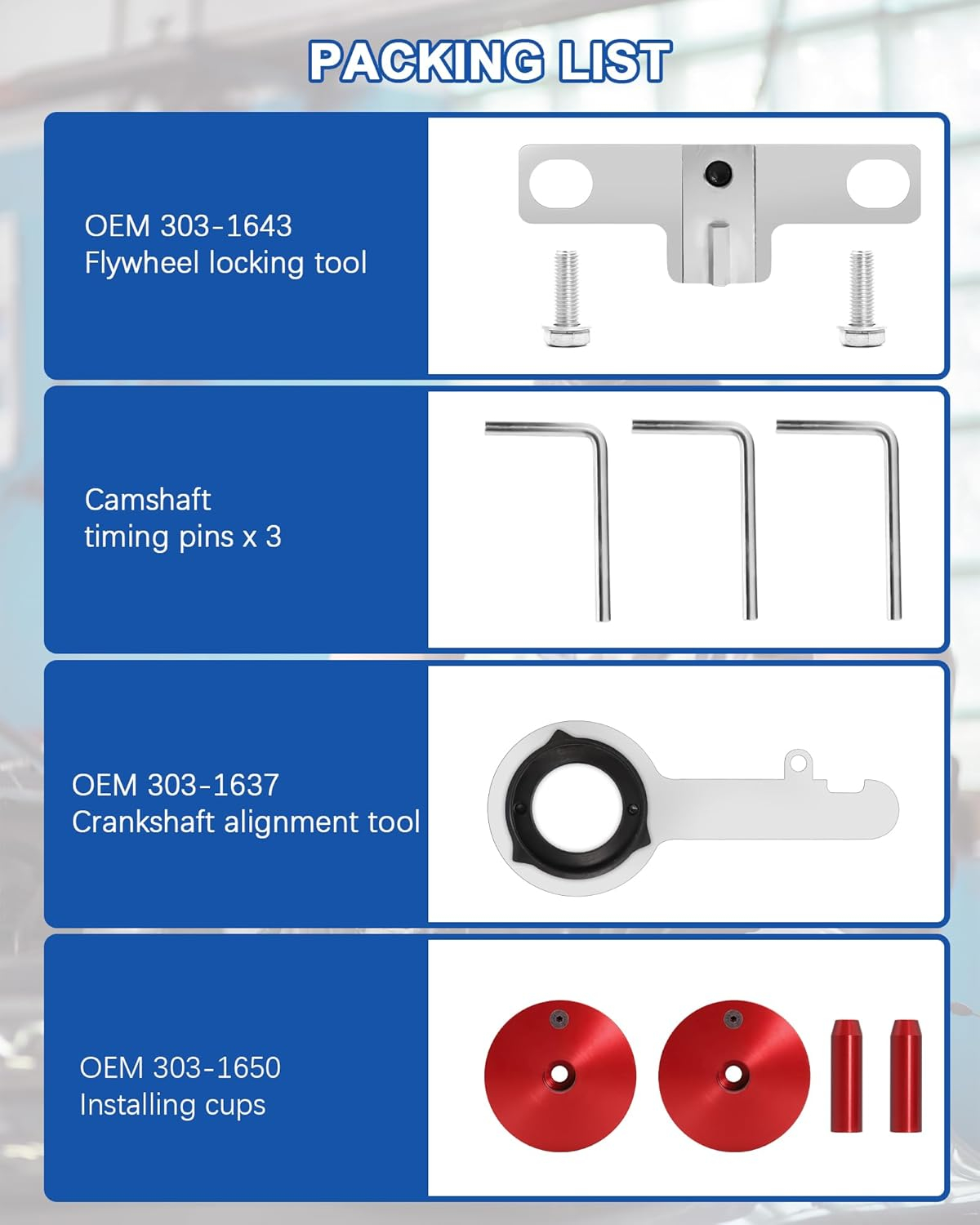 Setul de instrumente de reglare a motorului: Instrumentul pentru setarea arborelui cu came conține un instrument pentru instalarea centurii de cronologie pe arborele cu cameră. Instrumentul de blocare a roților de zbor corespunde numărului OEM 303-1643, instrumentul pentru alinierea arborelui de coarde corespunde numărului de OEM 303-1637, iar instrumentul de plasare a centurii de cronologie corespunde numărului OEM 303-1650.