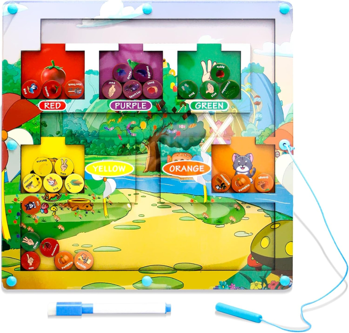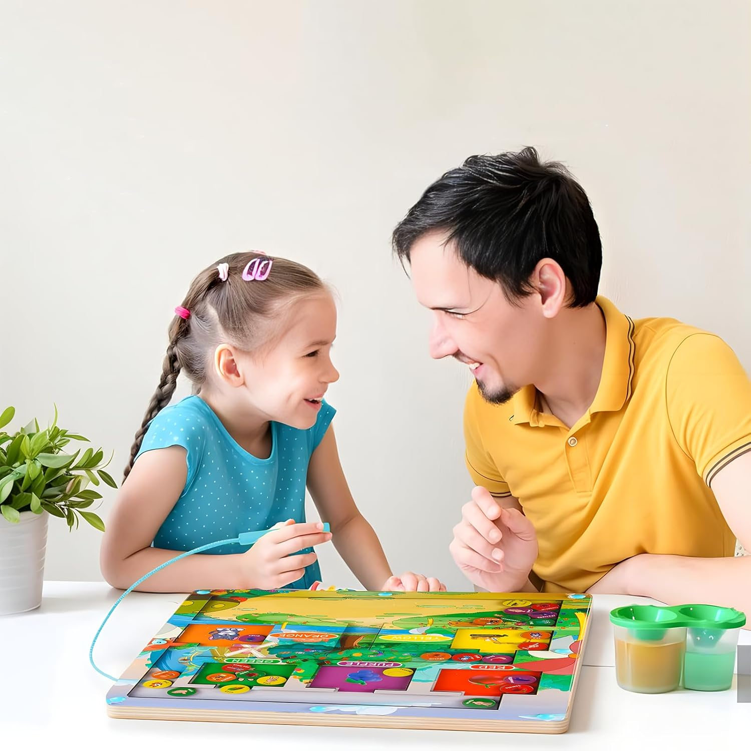 Material sigur și durabil: placa noastră de activitate magnetică este realizată din lemn natural, cu o suprafață netedă și colțuri rotunjite care îl face sigur pentru mâinile copiilor; discul acrilic de înaltă calitate oferă o durabilitate și o stabilitate suplimentară; boabele magnetice închise împiedică înghițirea și fac jocul sigur pentru copiii mici; placa magnetică are, de asemenea, un spațiu de stocare pentru stiloul magnetic, astfel încât să nu se piardă