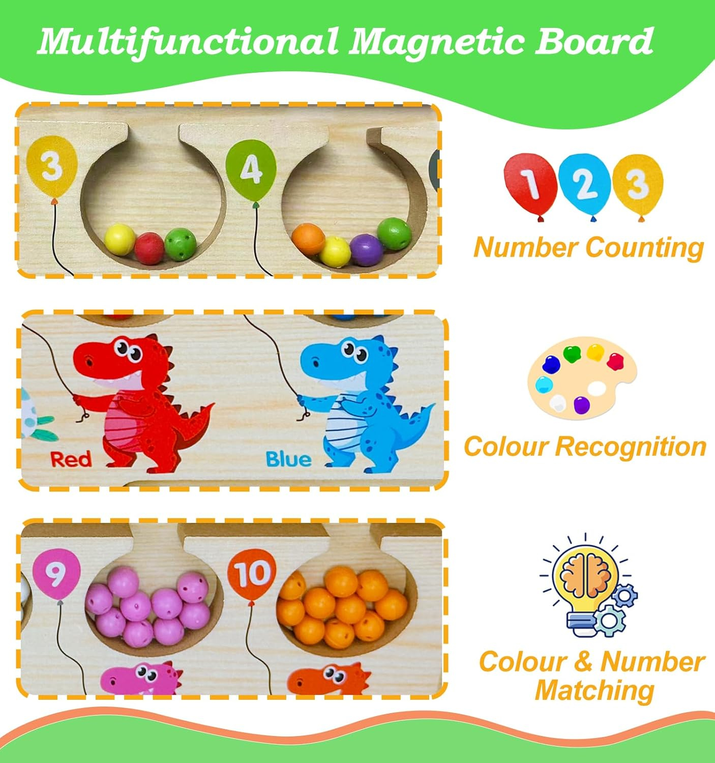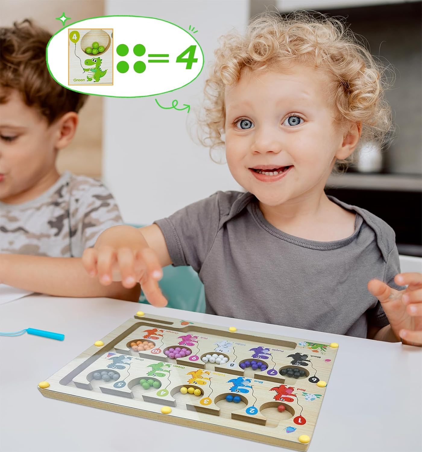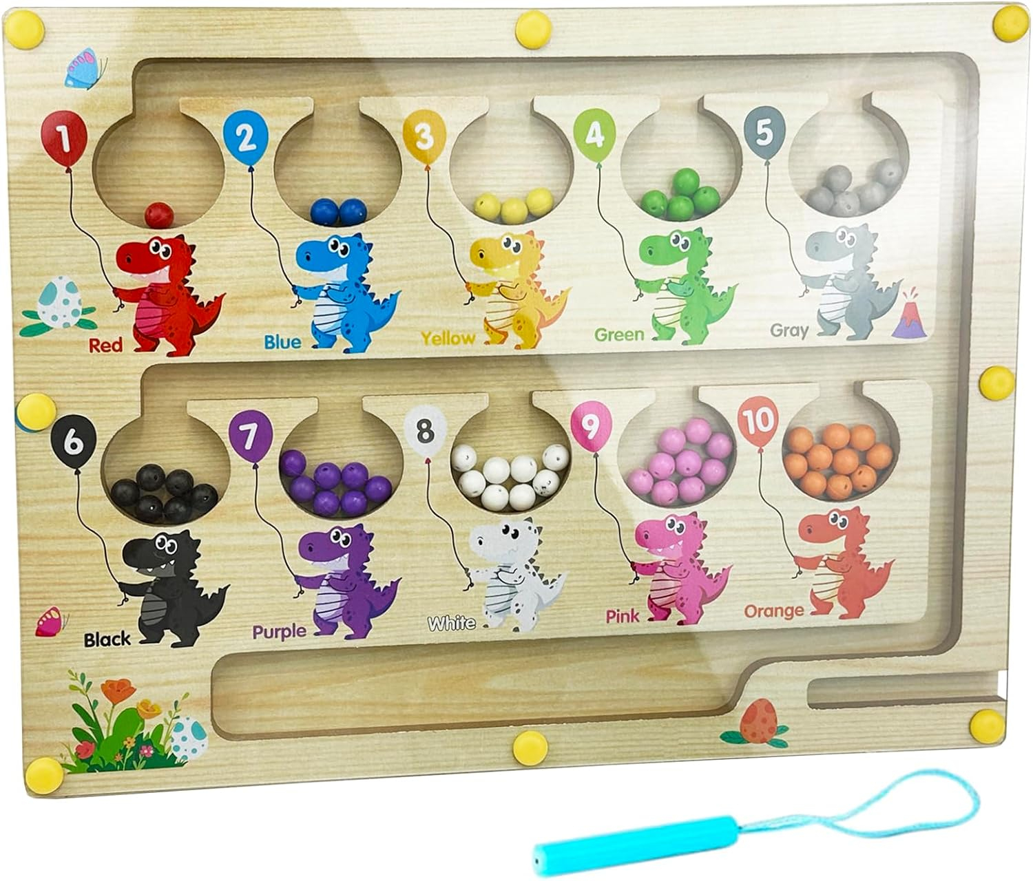 Labirintul de dinozauri magnetici - Un joc de sortare matematică interesant care îi ajută pe copii să recunoască culorile și să învețe numere! Labirintul nostru robust din lemn are zece "cutii de vopsea" încorporate reprezentând numerele 1-10 și 55 de bile magnetice. Copiii pot folosi bastoane magnetice pentru a desena culorile și cantitățile corespunzătoare ale bilelor magnetice în gălețile de vopsea corespunzătoare