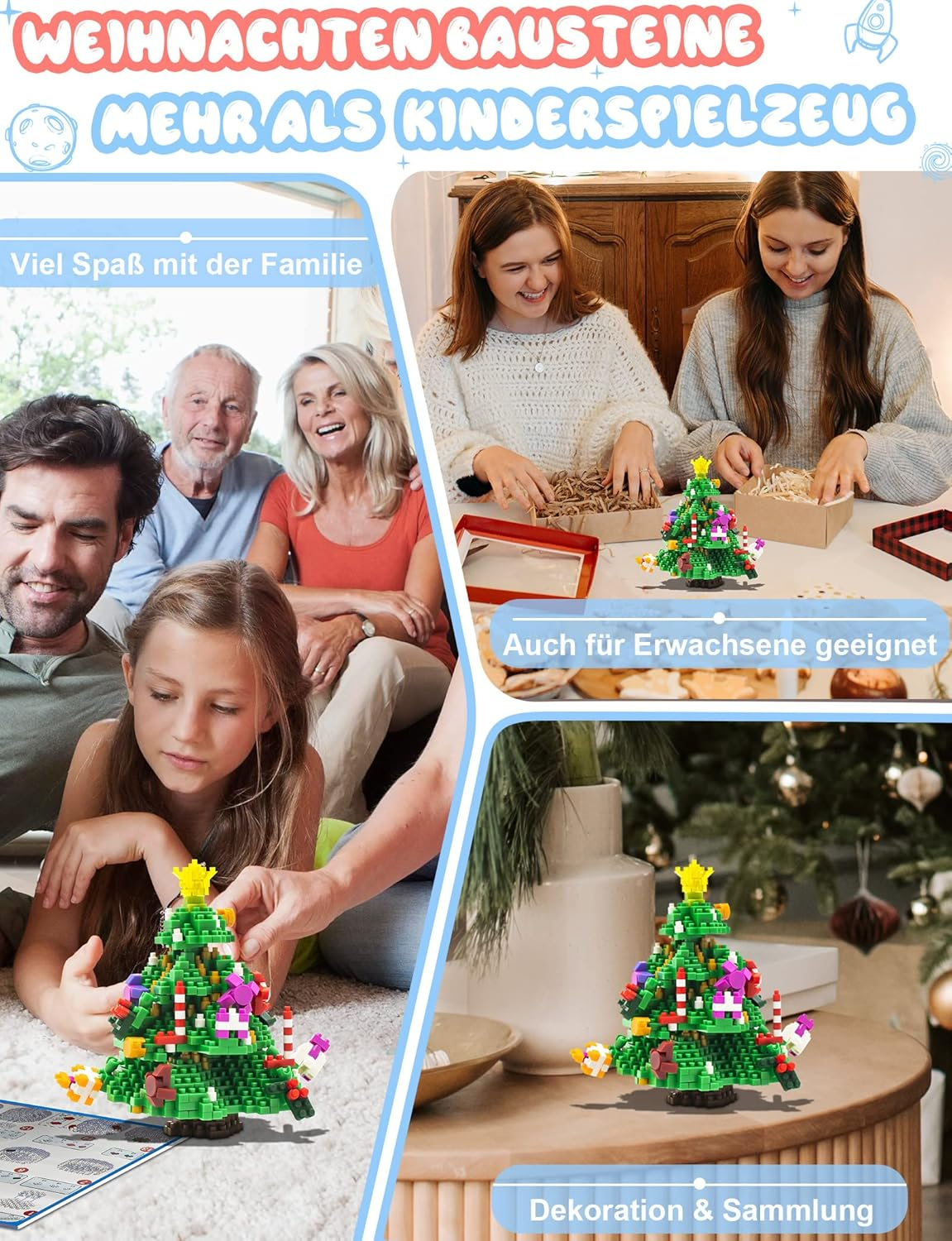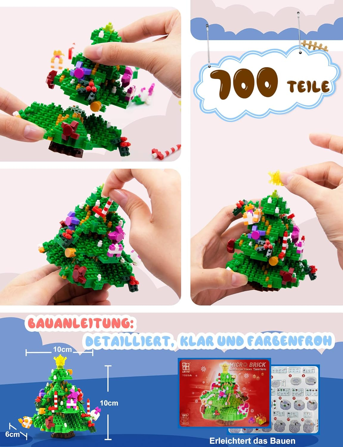 Brad de Crăciun cu blocuri de prindere: cine poate spune "nu" acestui set drăguț de blocuri de pom de Crăciun? Este decorat cu decorațiuni clasice: stele strălucitoare, panglici, trestie de zahăr, cutii de cadouri etc. Bradul de Crăciun arată uimitor, fie pe un birou, fie lângă alte colecții de jucării.