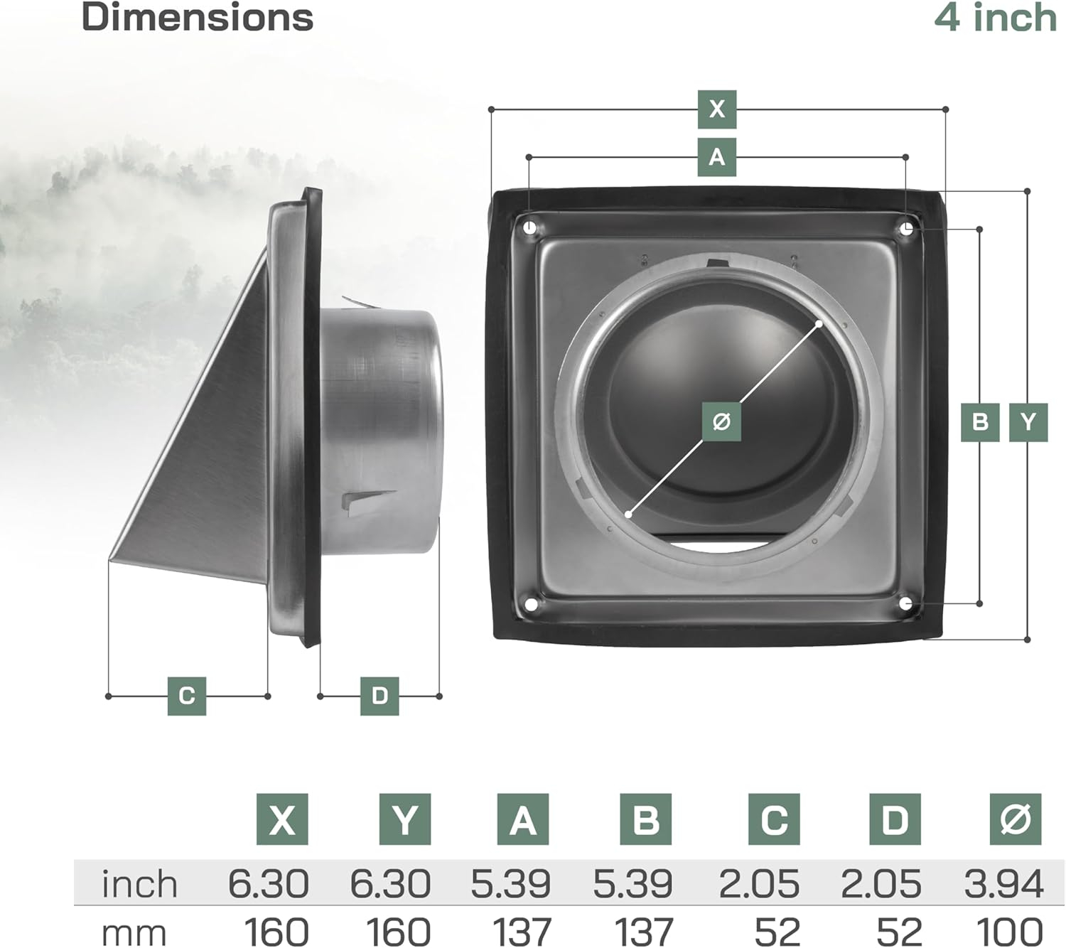 METAL DURABIL: Un aport din oțel inoxidabil în formă de pătrat sau capac de aerisire de evacuare, conceput atât pentru utilizare interioară, cât și pentru exterior. Pentru introducerea într-o conductă de uscător, conducta de ventilație HVAC sau conducta.