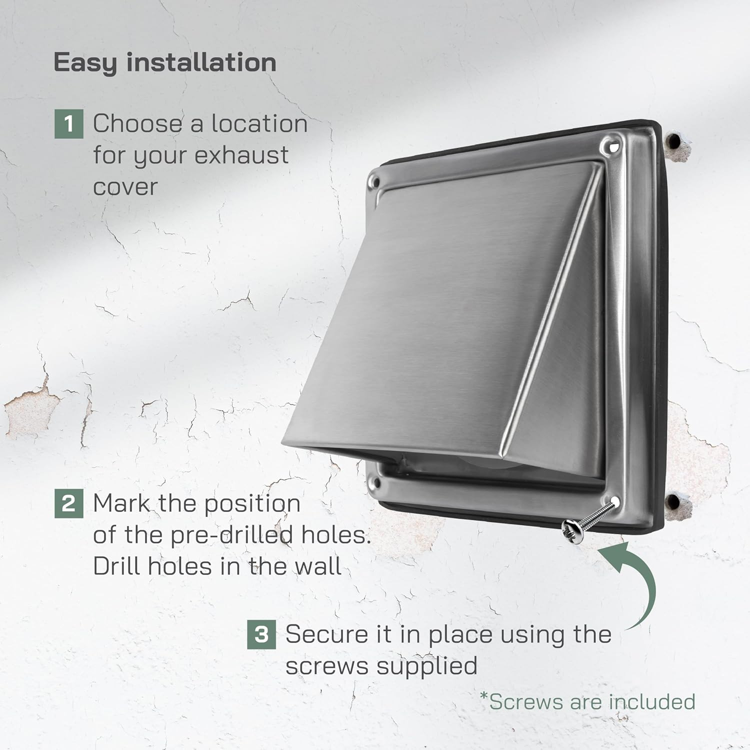 INSTALAȚIE UȘOARĂ ȘI RAPIDĂ: Capacul de ventilație de perete poate fi instalat fără instrumente profesionale sau asistență profesională. Instalați în doar câteva minute, ușor de deschis, o bună ventilație, maximă evacuare. Placa de flanșă de legătură are găuri de montare pre-forate în fiecare colț, permițând produsului să fie atașat în siguranță la perete cu 4 șuruburi.