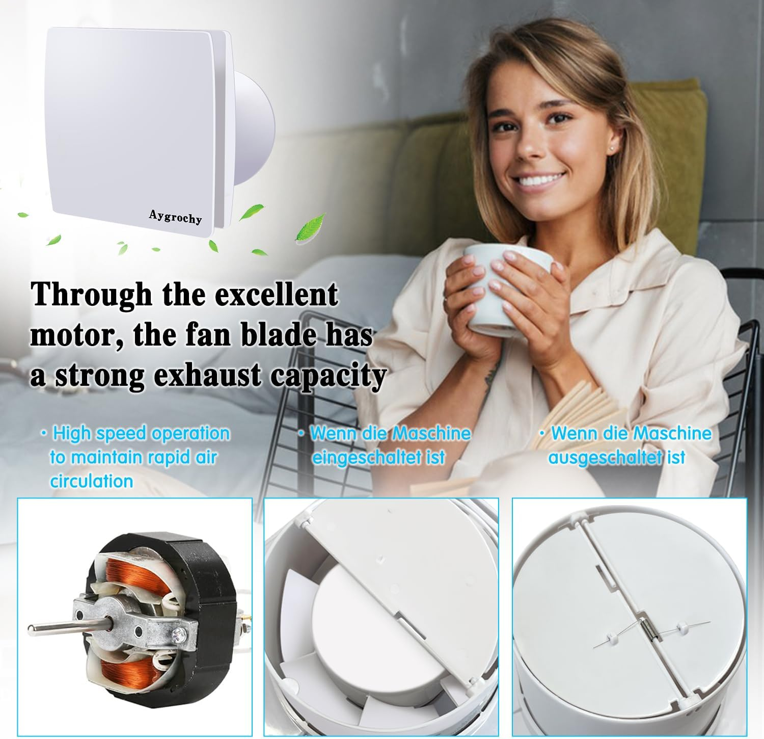 Ventilator de baie cu cronometrare și senzor de umiditate. Cadrul principal și lama ventilatorului de evacuare a băii sunt realizate din material ABS anti-UV, protecția IP44. Ventilația este rapidă și stabilă, iar nivelul de presiune acustică este de 34 dB. Diametrul țeii este de 100 mm, viteza de 2200-2500 rpm, volumul de aer de 108 m Temperatura de lucru de la -20°C la 60 ° C, umiditatea de lucru mai mică de 80%.