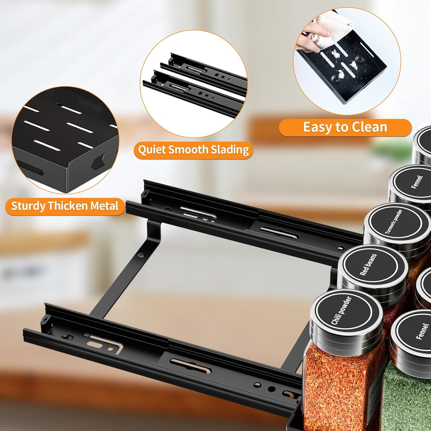 🥫[Organizația Perfectă, Înălțime reglabilă]: Suportul de condimente de la PNNP este o soluție perfectă pentru puțurile dulapului de bucătărie. Are o funcție foarte ajustată și se poate adapta cu ușurință la dimensiunea diferitelor dulapuri și la dimensiunea condimentelor și a sticlelor de condimente. Sertarul solid din aluminiu și sistemul de patinaj ușor al rulmului de rulare fac ca condimentul și sticla de condimente să nu mai fie dezordonate.