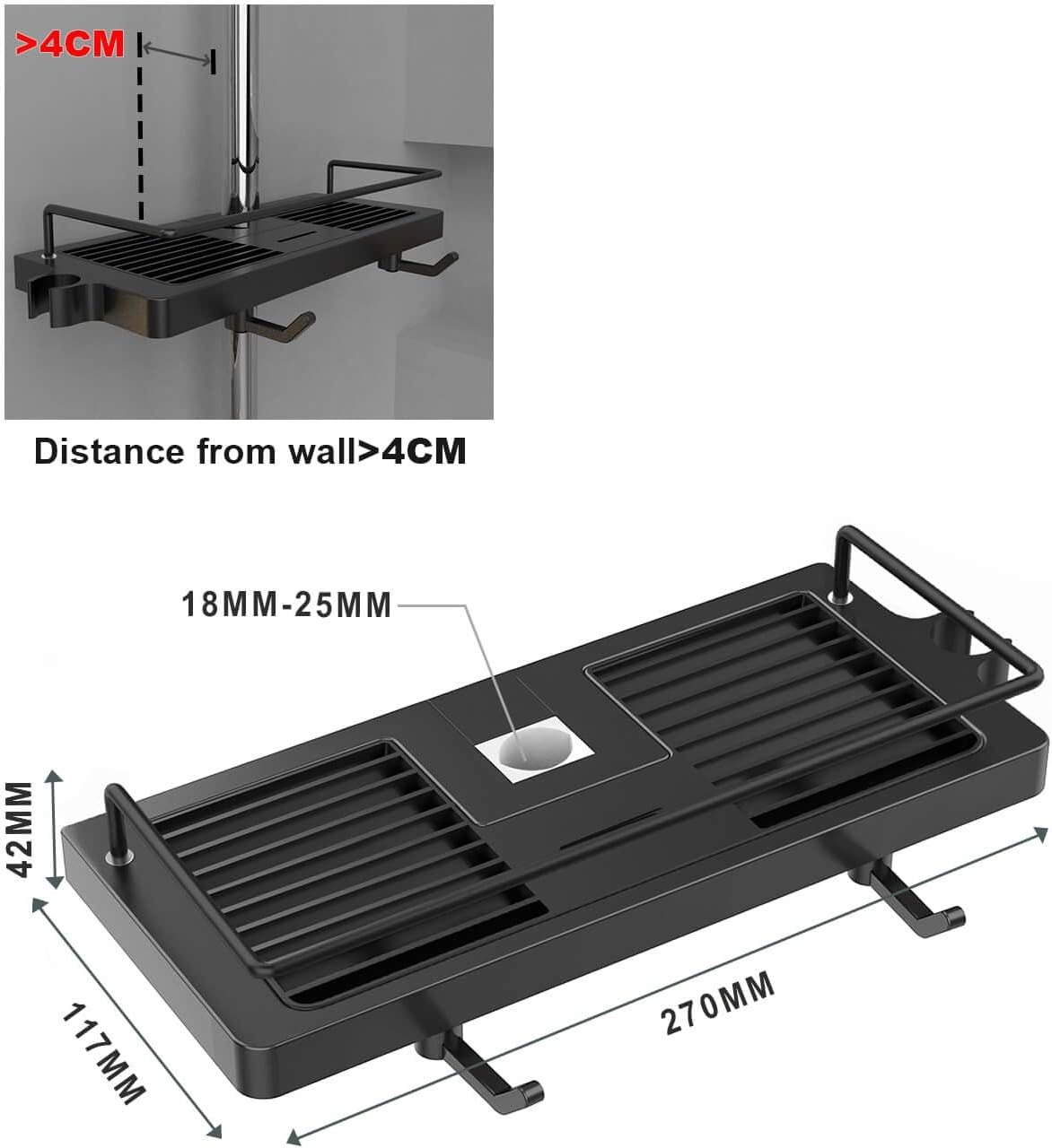 Dimensiune: 27CM*12CM*5CMMește: ABS plastic + border din oțel inoxidabilCoolr: BlackInstalare: BlackInstalare: agățat fără cuieLimitizări: Duș de duș la cel puțin 4 cm distanță de perete