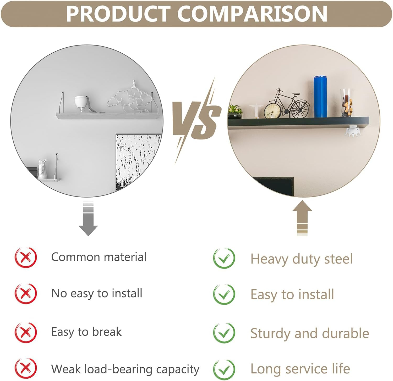 Ușor de instalat: Echipat cu șuruburi de montare și tuburi de expansiune pentru instalare ușoară. Pentru o instalare ușoară, trebuie doar să preparați o șurubelniță. Suporturile de perete pentru rafturi au suprafețe lustruite și colțuri rotunjite pentru a spori siguranța și a preveni zgârieturile