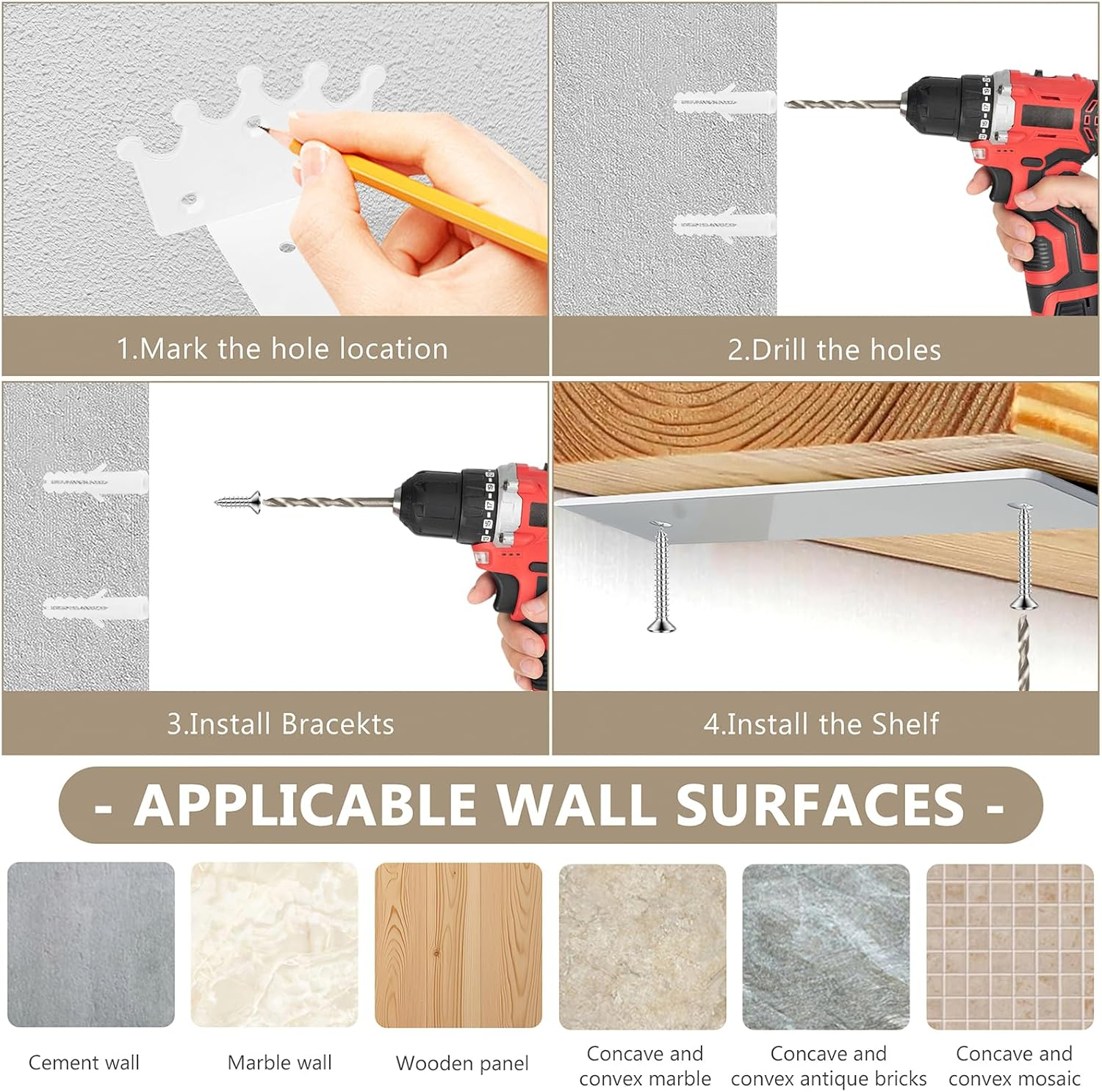 Aplicație multiplă: Potrivit pentru instalarea rafturilor, a rafturilor de afișare, a rafturilor de grădină, a rafturilor de depozitare, a suporturilor de perete în aer liber etc. în bucătării, dormitoare, băi, camere de studiu, săli de zi, săli de mese, balcoane, magazine, ateliere, curți etc.