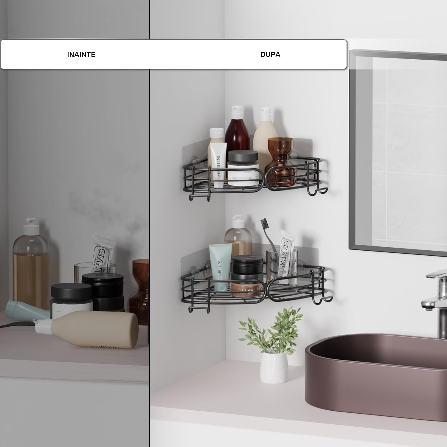 MATERIAL DE ALIAJ DE ÎNALTĂ CALITATE - Acestea nu sunt rafturi de perete de găurit din aliaj de înaltă calitate, cu o suprafață mată neagră acoperită cu pulbere, sunt rezistente la rugină și durabile. Deține până la 10kg fiecare. Designul raftului din colț permite o mai bună utilizare a spațiului de colț, a băii, a bucătăriei și a toaletei pentru oaspeți.
