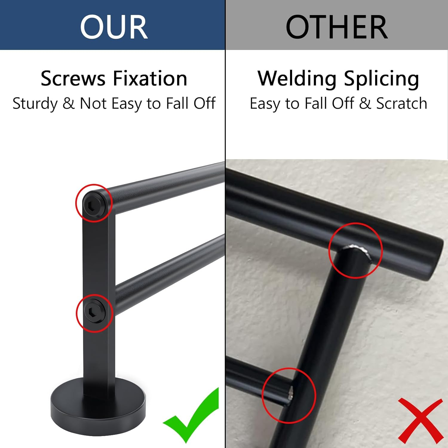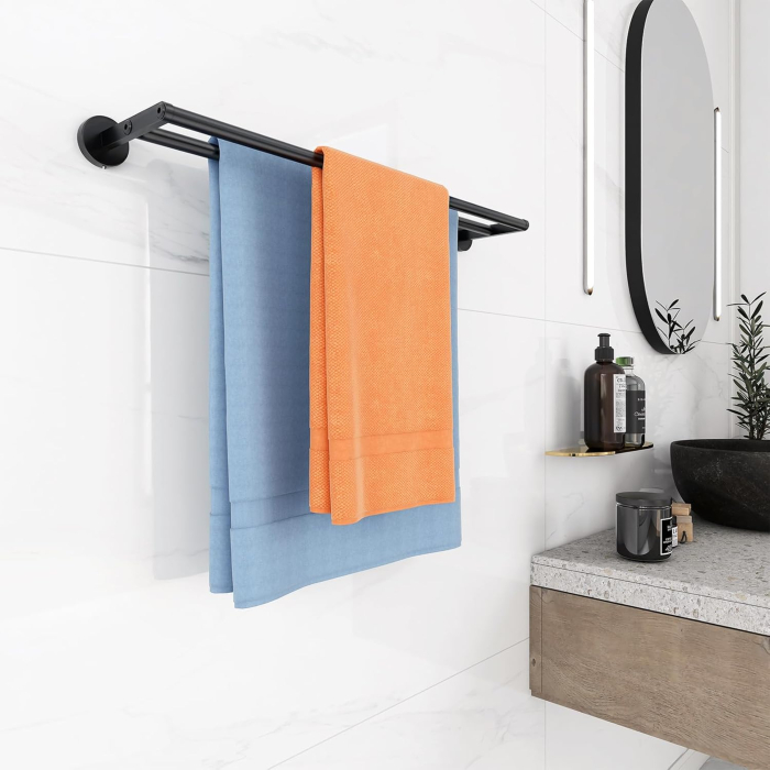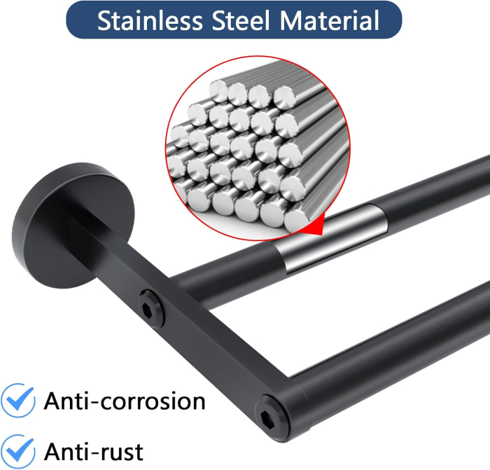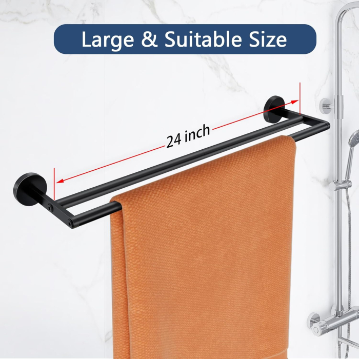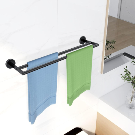 • Bun pentru uscarea prosoapelor - Distanța dintre șina de prosop neagră 2 inci, care este potrivită pentru 2 prosoape în același timp. Suportul pentru prosoape de baie vă poate usca prosoapele rapid. Deci, utilizați șina noastră de prosop dublu în baia dvs. Designul suportului de prosoape - Suportul nostru de prosop de baie este proiectat cu 2 șine de prosop, care nu numai că atârnă prosoapele bine, dar dețin și frumos și practic. Între timp, bara de prosoape de baie este asamblată cu șuruburi în loc de sudare, care este mai robustă și nu este ușor de căzut.