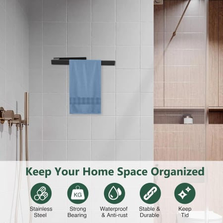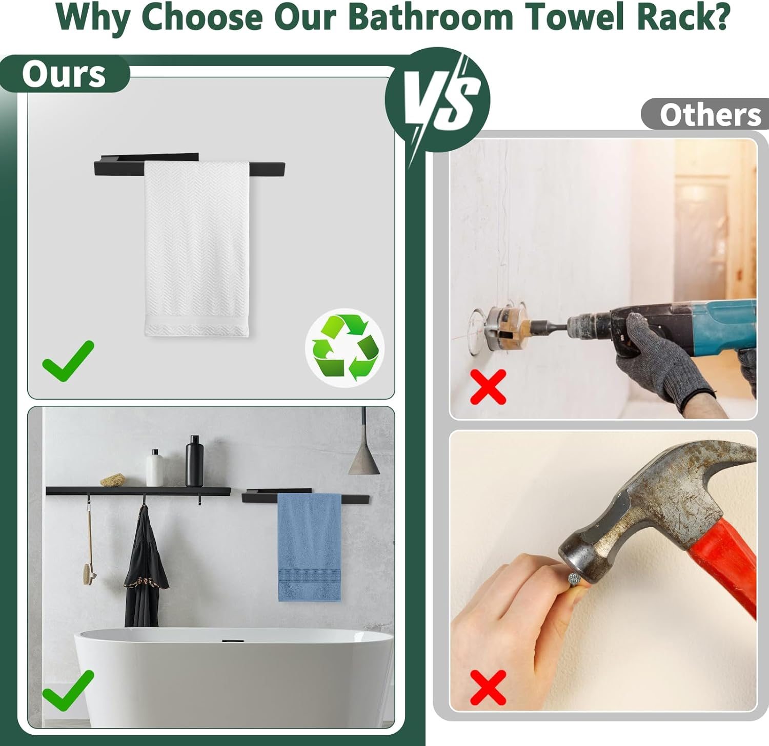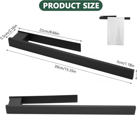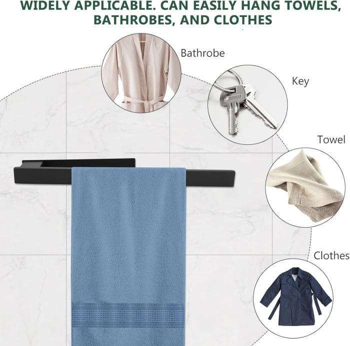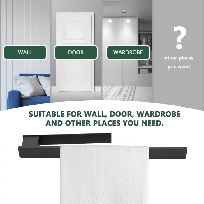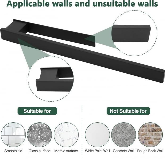 Acest suport de prosoape mat negru este fabricat din 304 de oțel inoxidabil, impermeabil, rezistent la rugină, rezistent la zgârieturi, fără margini ascuțite, fără zgârieturi. Designul modern oferă băii și bucătăriei o decorare simplă și elegantă. ✅asy pentru a instala, simplu și eficient: Cu acest suport de prosop din baie, pur și simplu desprindeți filmul de protecție pe spatele plăcuței auto-adezănțului, lipiți suportul de prosop la peretele neted, fără a fi necesar forarea și apăsați-l timp de 30 de secunde. Și dacă atârnați acest articol timp de 24 de ore, economisiți timp și energie fără a deteriora peretele. ✅a pe scară largă aplicabilă oricărei suprafețe netede: potrivite pentru suprafețe netede și curate, cum ar fi marmură, țiglă, lemn, plastic și sticlă. Vă rugăm să rețineți că acest suport de prosop nu este potrivit pentru pereții pictați, gips-carton, tapet, pereții stucului și pereții calcaroși. Odată ce se lipește de o suprafață aspră, acesta poate cădea ușor și peretele dvs. poate fi deteriorat atunci când îl îndepărtați. Pentru o experiență optimă, vă rugăm să o utilizați pe o suprafață netedă. STORAGE, TOOL OF CHOICE: Raftul de prosoape negre este potrivit pentru depozitarea prosoapelor, păstrându-le uscate și ordonate. Suportul de prosop este potrivit pentru agățat prosoape, prosoape de baie, prosoape de bucătărie, prosoape de ceai și prosoape în băi, bucătării și băi. Este o alegere bună ca un cadou pentru familia sau prietenii tăi.
