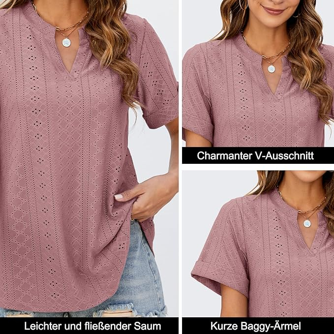 • Broamică elegantă cu găuri și tăietură liberă: bluza de vară pentru femei impresionează cu broderie fină, V-neck și o tăietură liberă, confortabilă, pentru libertatea maximă de mișcare