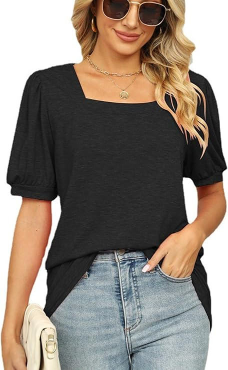 Tricou larg de vară pentru femei, decolteu patrat, maneci scurte bordurate, negru M