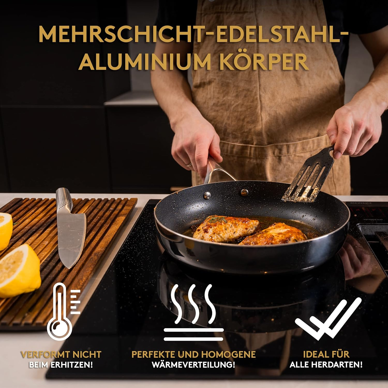 Elegant și fiabil: designul se potrivește în orice bucătărie bună, aprox. Mânerul ergonomic din oțel inoxidabil de 23,5 cm protejează mâinile de arsuri. Desigur, tigaia de gătit este potrivită pentru inducție și mașină de spălat vase.